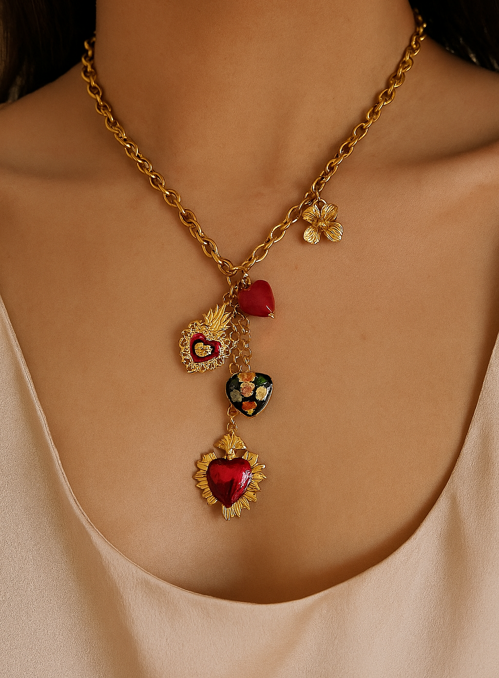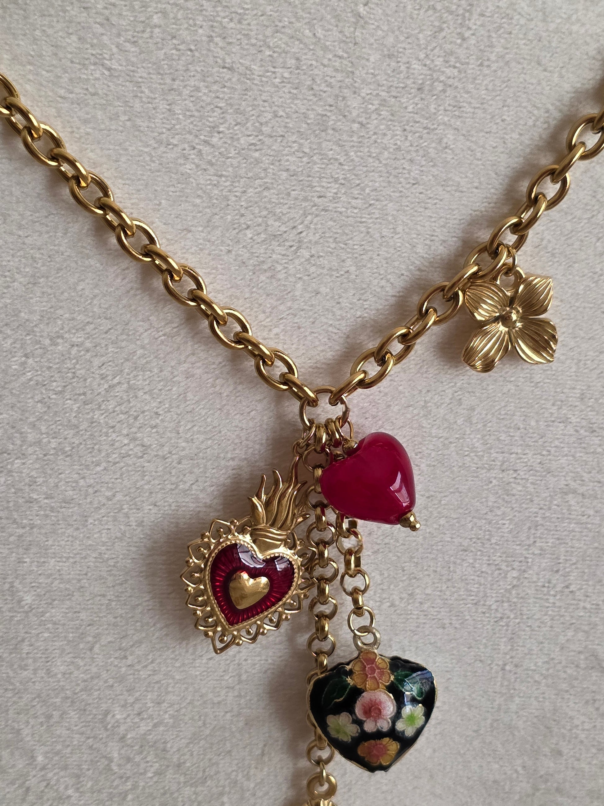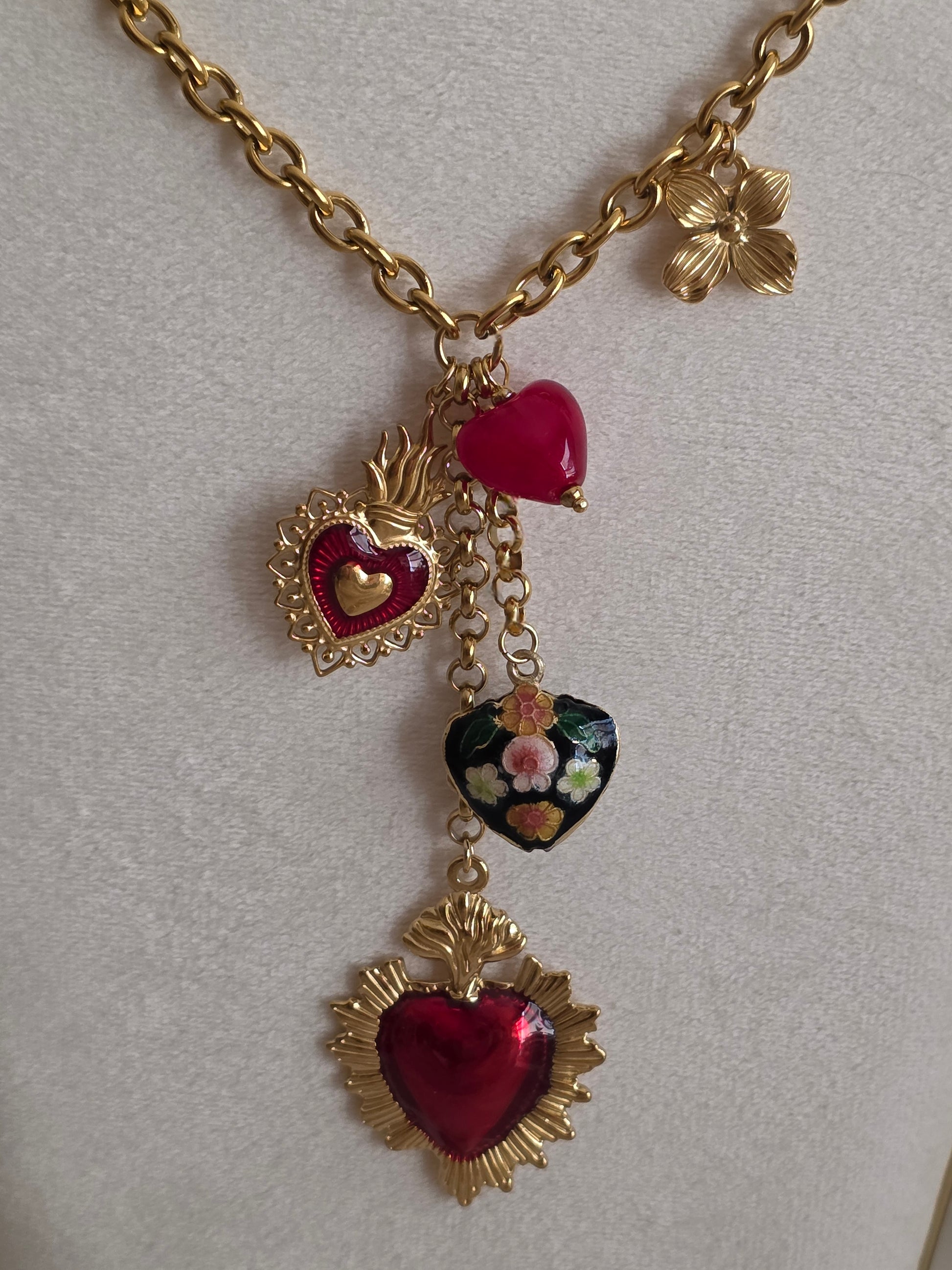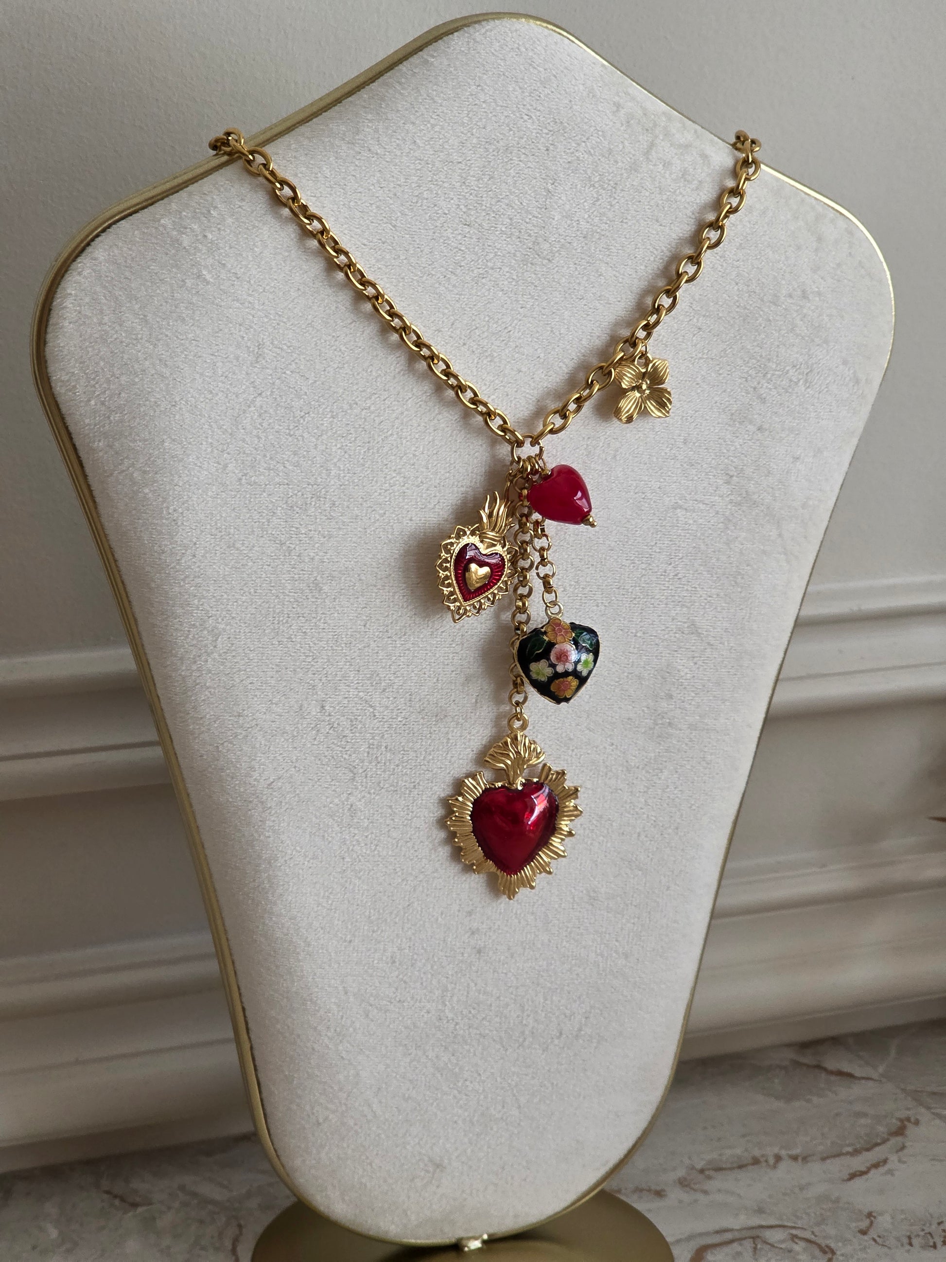 Turn heads with this stunning statement necklace, featuring a delicate gold-toned chain adorned with vibrant heart charms. The design showcases rich red enamel hearts, a floral-painted charm, and intricate gold detailing for a romantic yet bold look. Perfect for adding a touch of vintage-inspired glamour to any outfit.