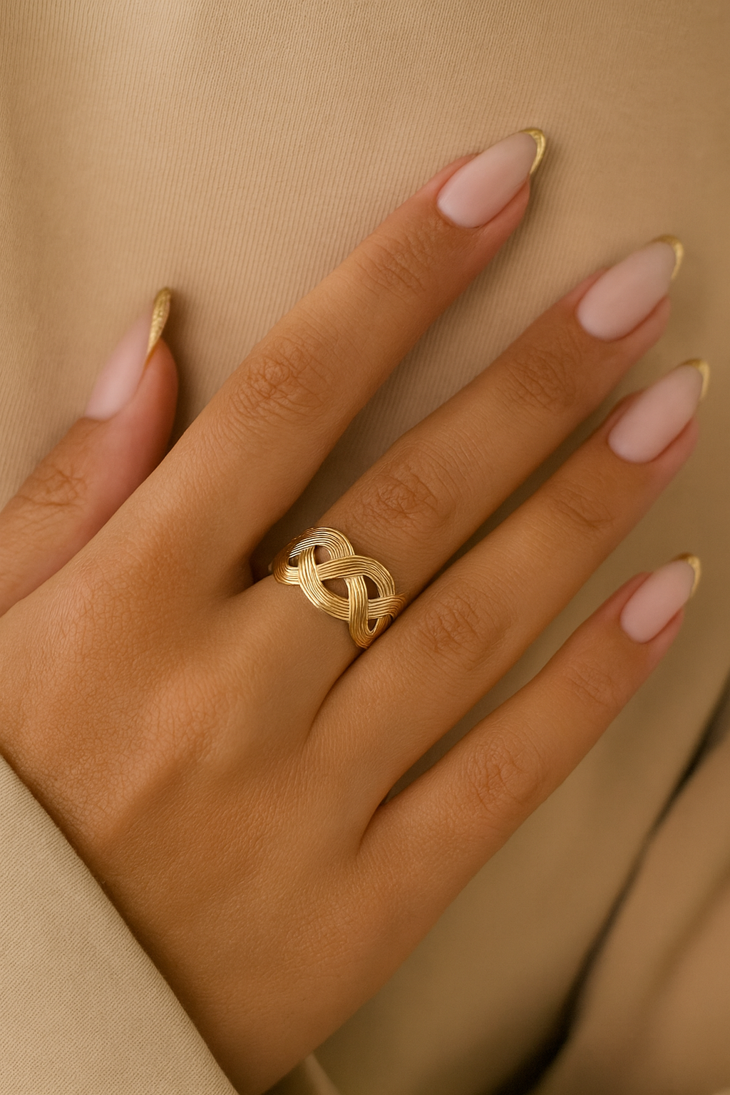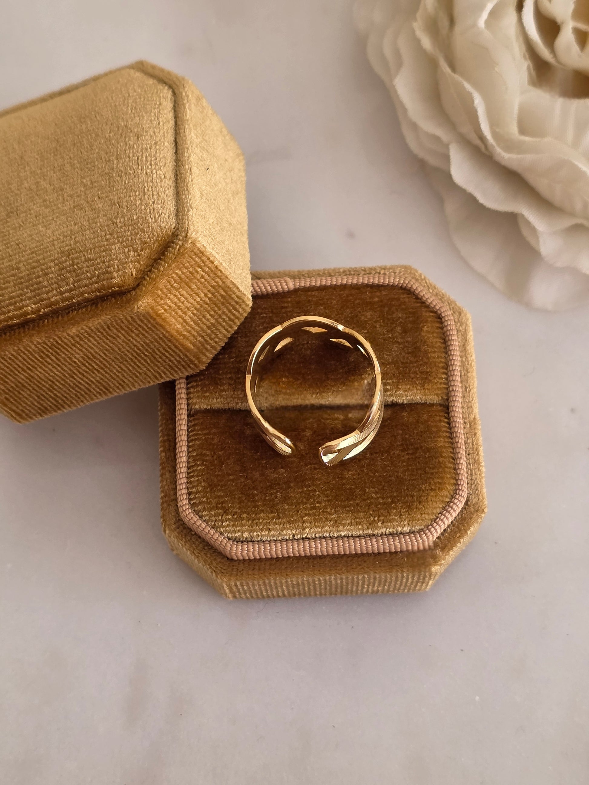 This stunning open ring features a unique woven design, crafted in high-quality gold plating over durable stainless steel. The intricate crisscross pattern adds depth and dimension, while the textured finish catches the light beautifully. Its open, adjustable band fits ring sizes 6 to 8, offering both comfort and versatility. Perfect as a statement piece or for everyday wear, this ring blends timeless elegance with modern sophistication. Waterproof, tarnish-resistant, and hypoallergenic — designed to last while keeping its shine.