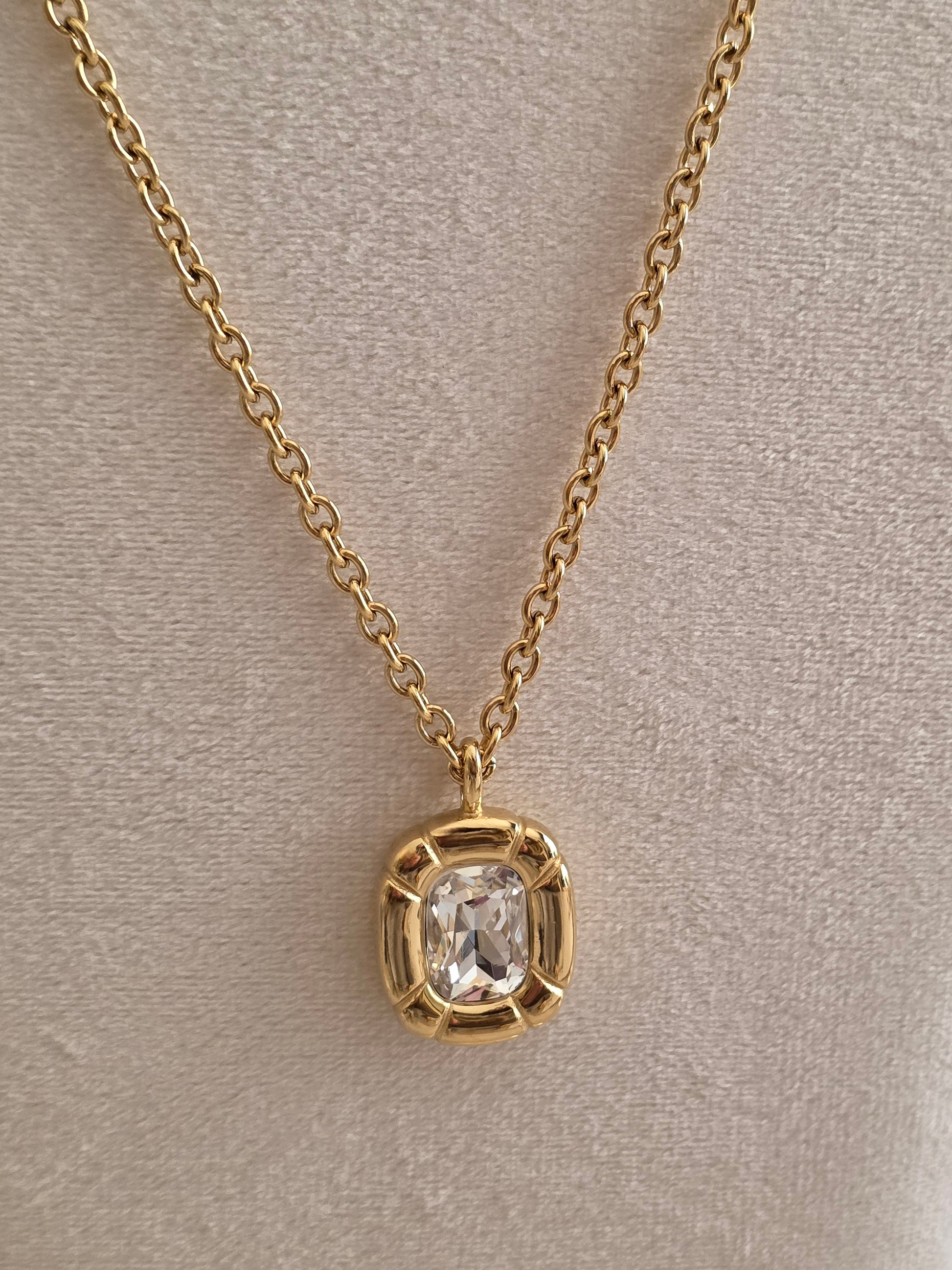 Timeless and refined, our Crystal Charm Long Necklace features a stunning cushion-cut cubic zirconia pendant encased in a bold gold frame. The elongated 82 cm long chain with a 6 cm extender allows for versatile styling — perfect for layering or wearing solo as a statement piece.
