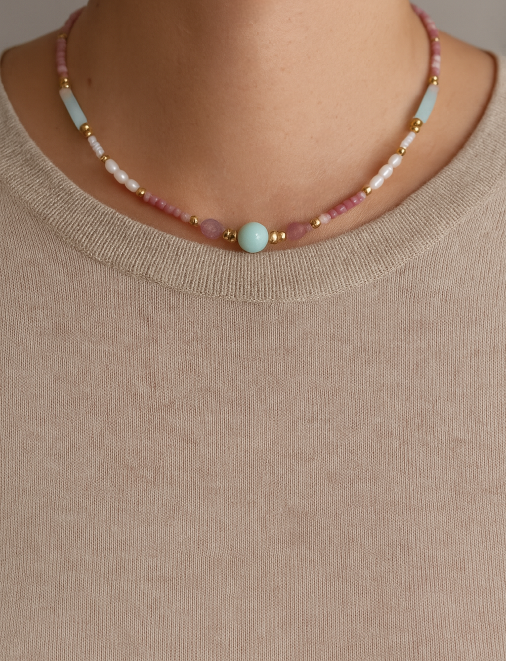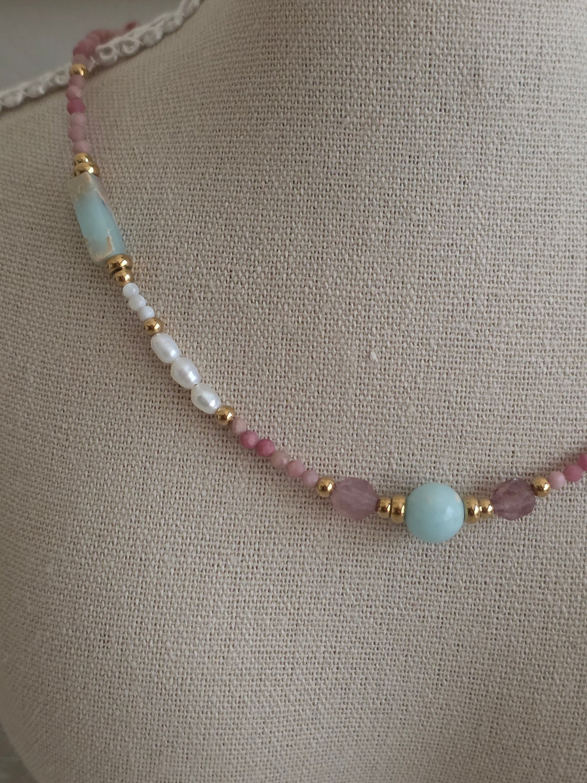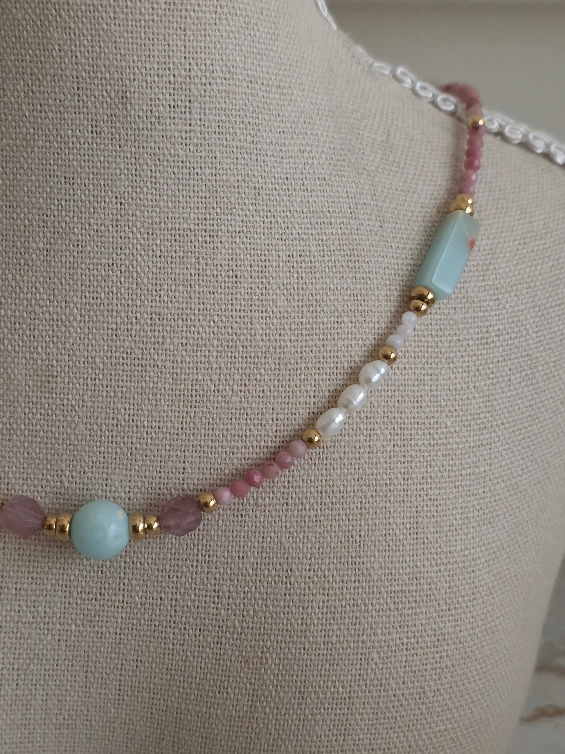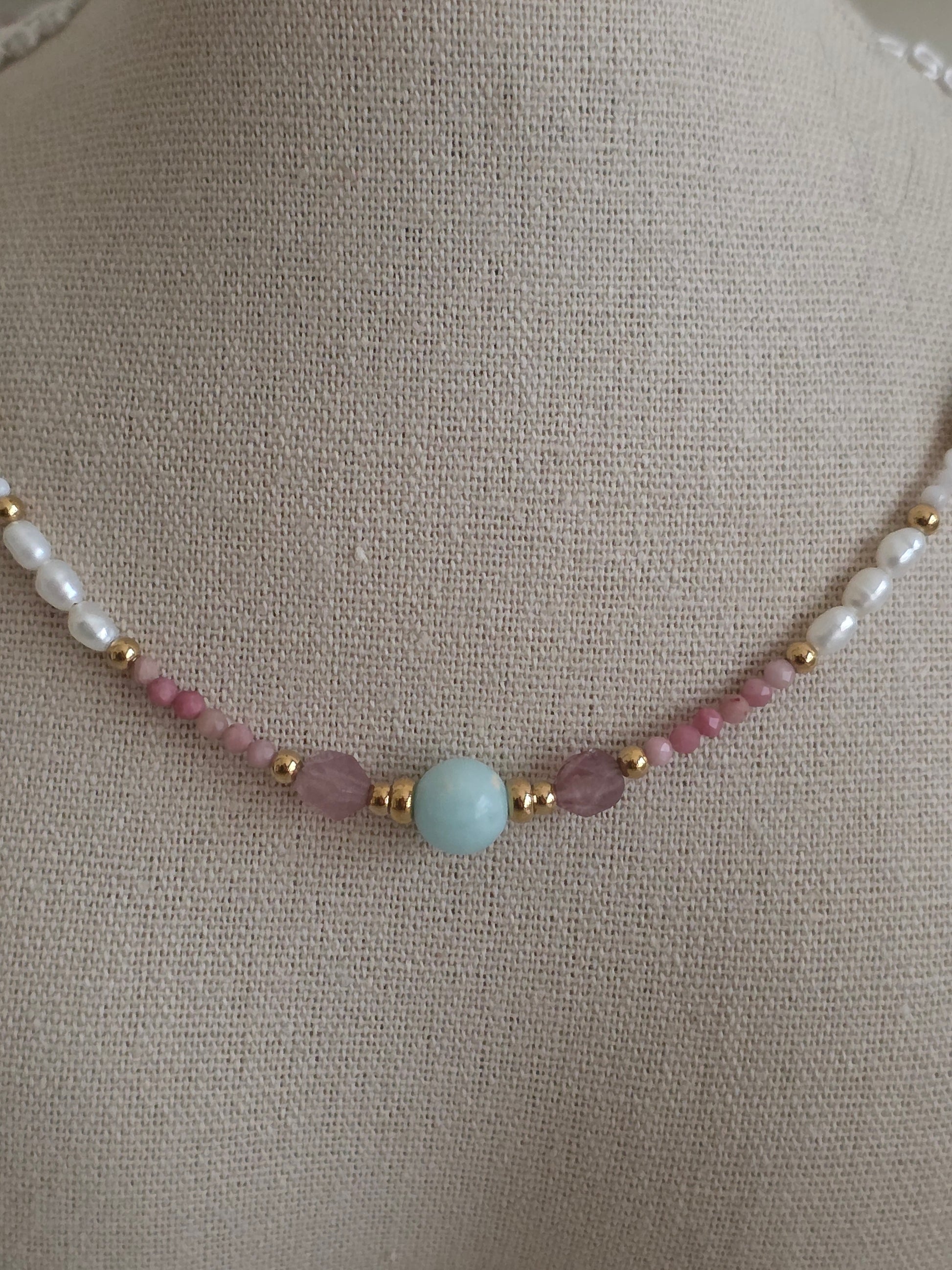 A soft blend of elegance and earthiness, this handcrafted necklace features soothing Amazonite stones, delicate freshwater pearls, and rosy Rhodochrosite beads, all accented with gold-toned details. The perfect piece to add a touch of calm colour and natural charm to your everyday look or special moments.