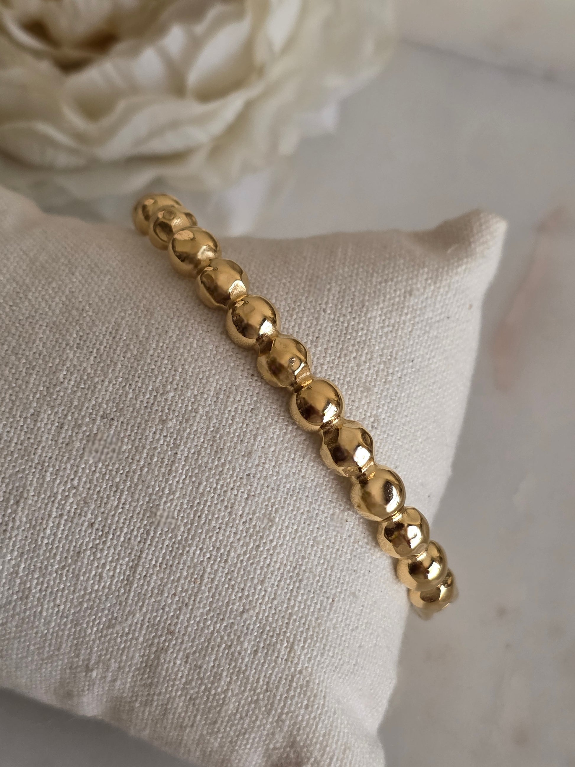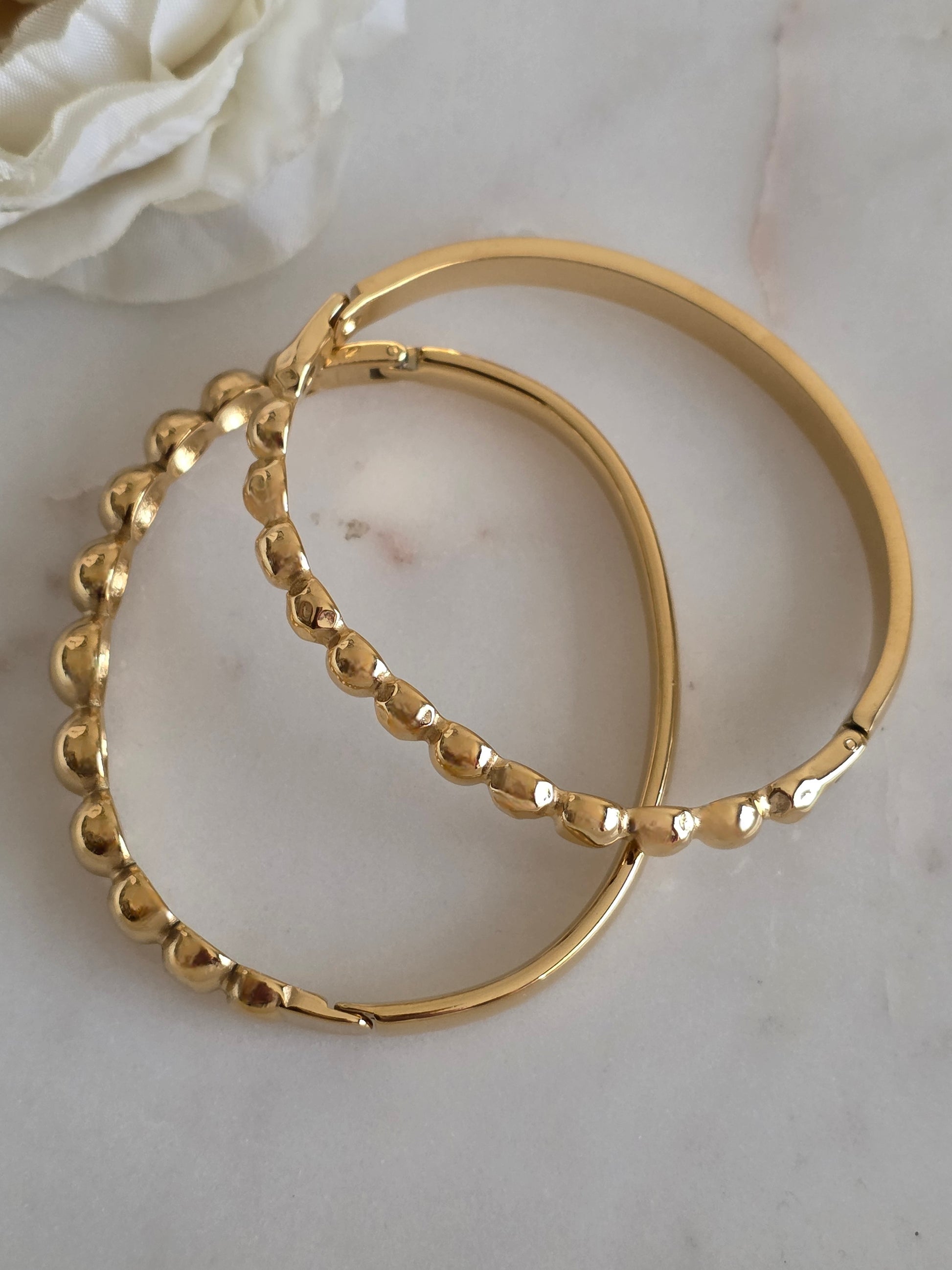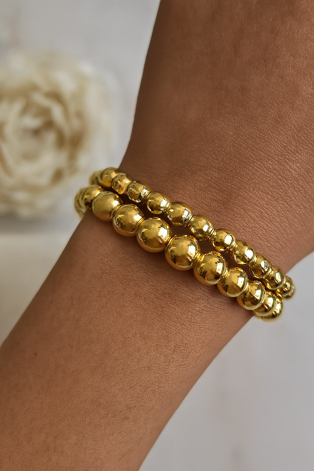 Elevate your everyday style with these timeless gold ball bangles. Featuring a sleek row of polished gold beads, they bring a modern yet elegant touch to any outfit. Perfect for stacking or wearing solo, these lightweight bangles add effortless charm to both casual and dressy looks. Made with high-quality, tarnish-resistant materials, they’re designed to stay beautiful for years to come.