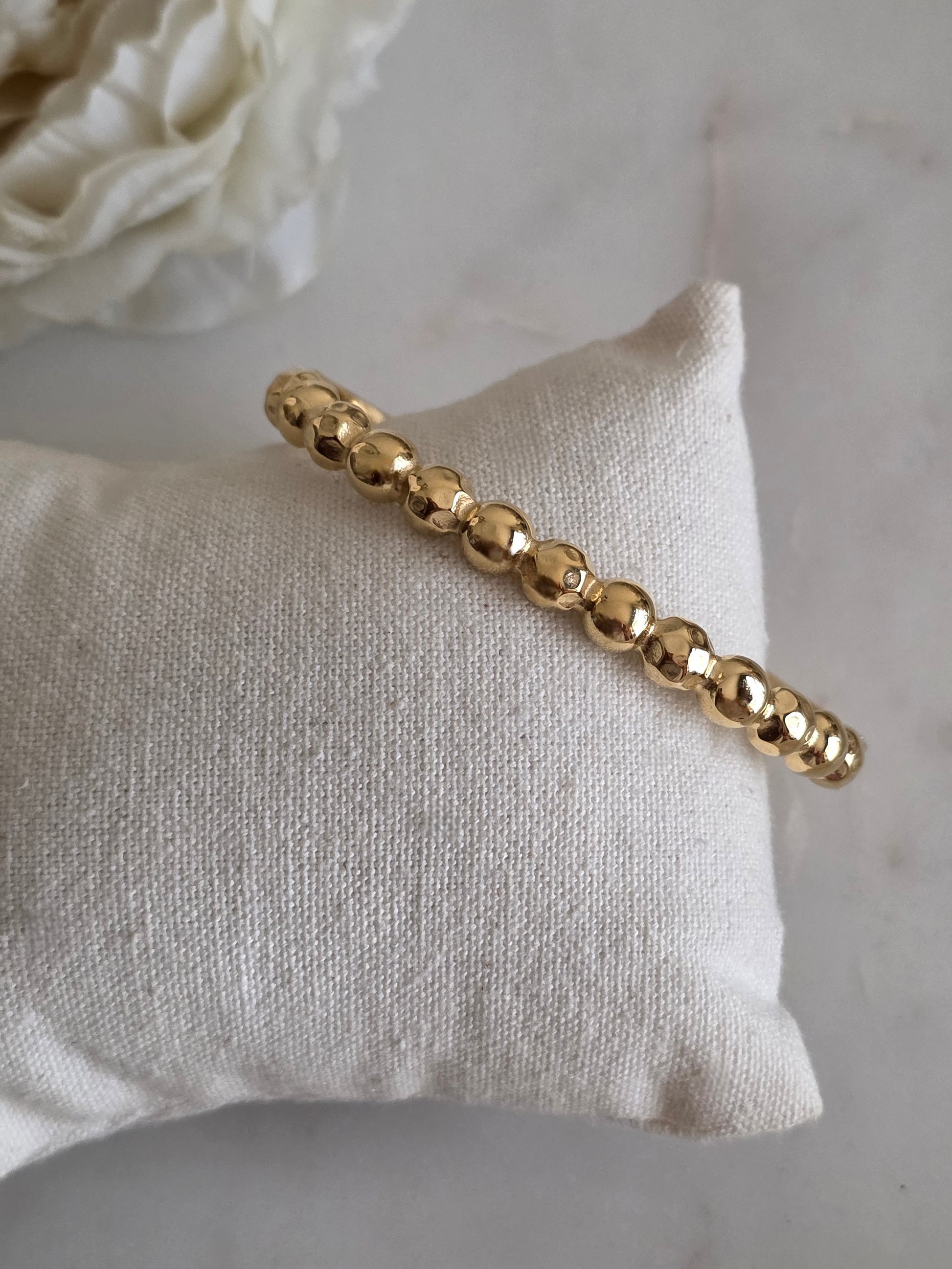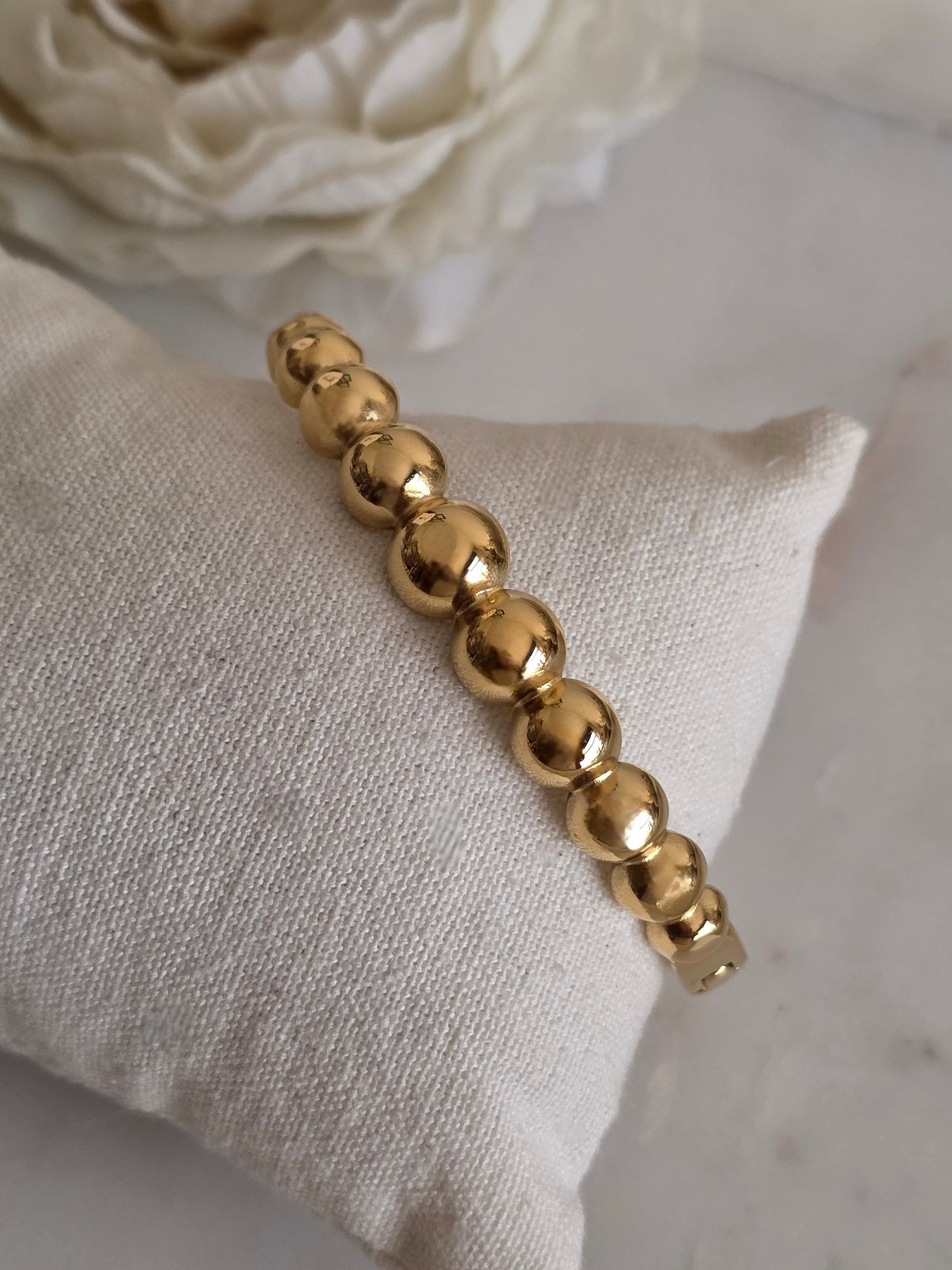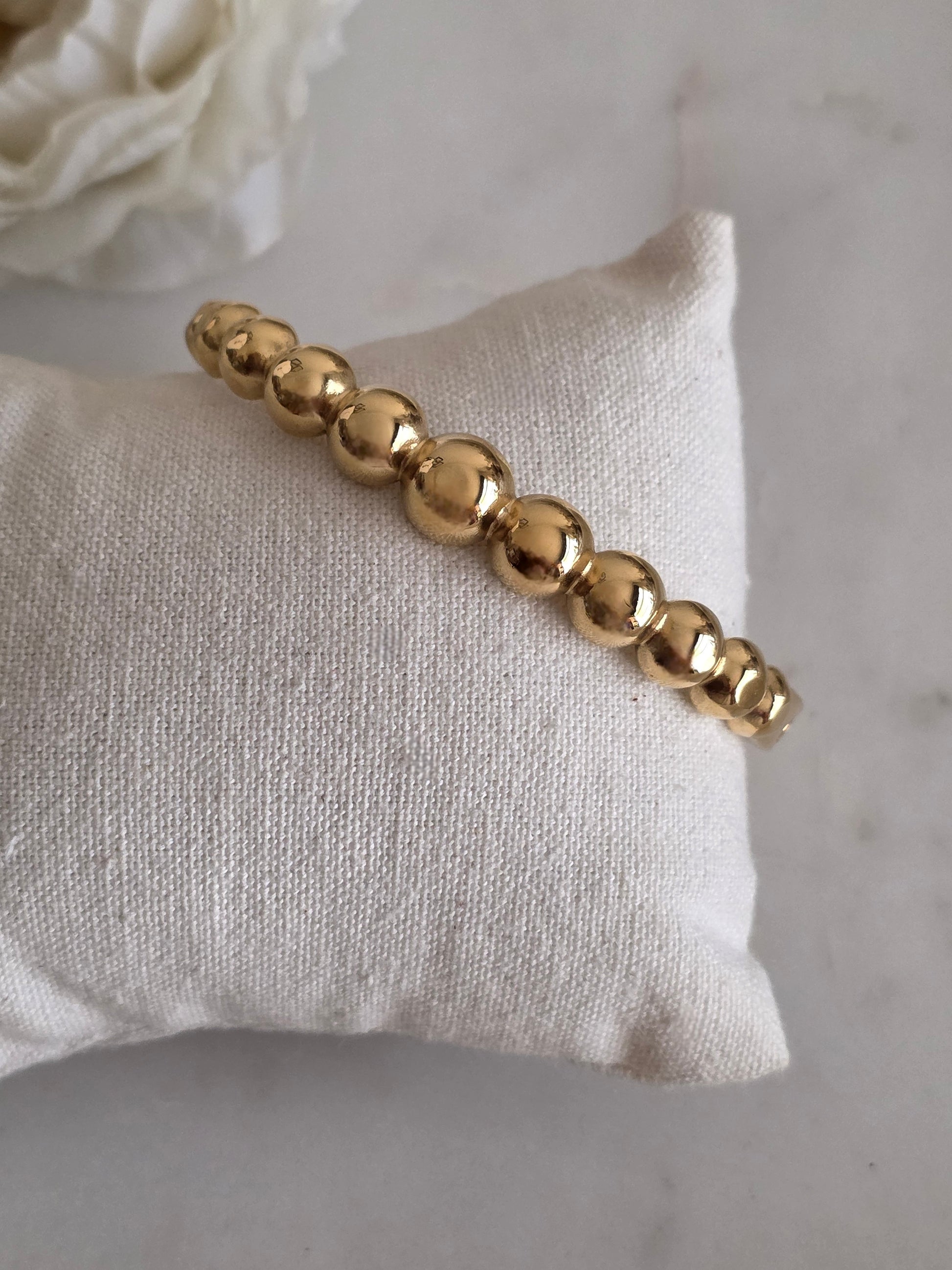 Elevate your everyday style with these timeless gold ball bangles. Featuring a sleek row of polished gold beads, they bring a modern yet elegant touch to any outfit. Perfect for stacking or wearing solo, these lightweight bangles add effortless charm to both casual and dressy looks. Made with high-quality, tarnish-resistant materials, they’re designed to stay beautiful for years to come.