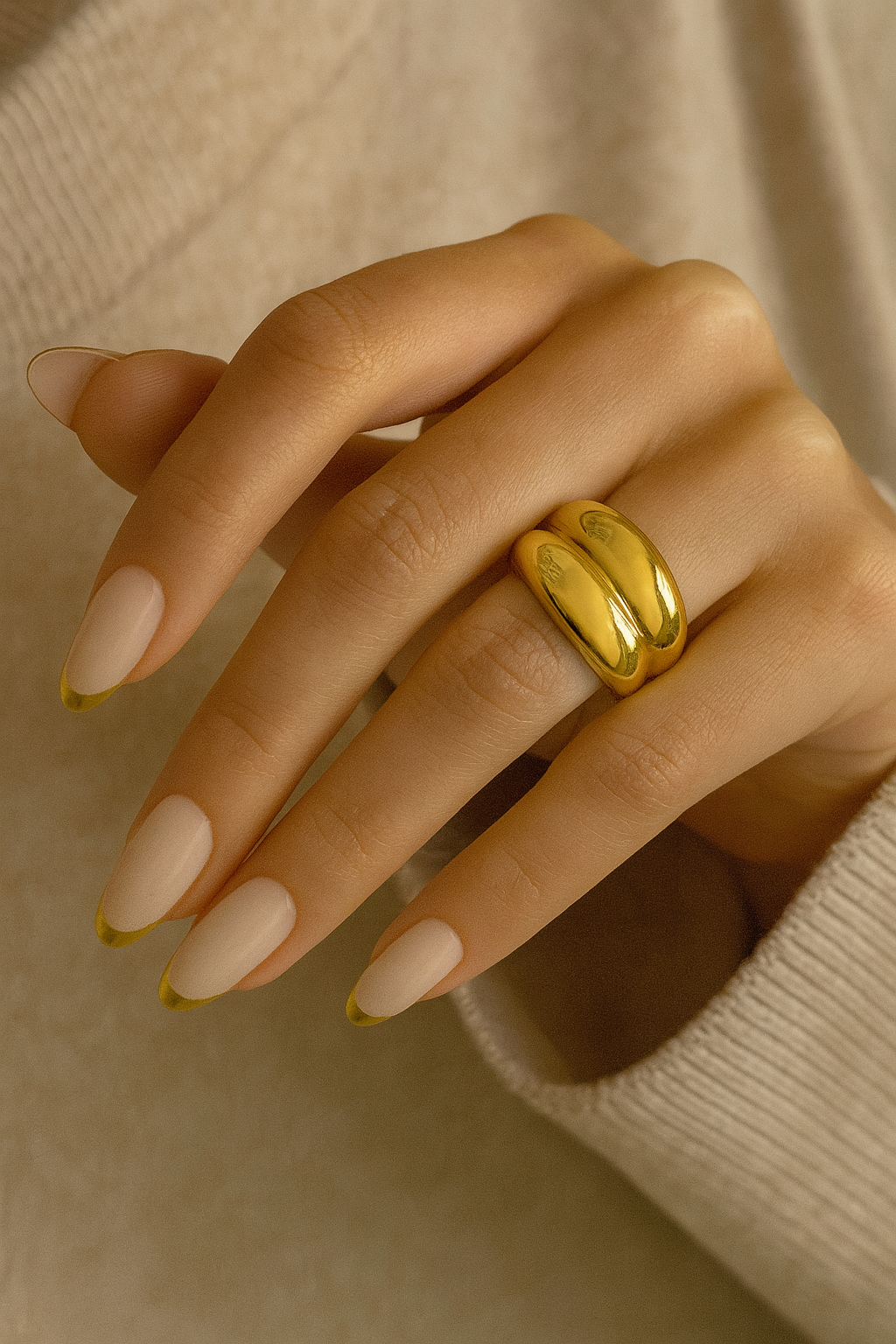 Make a statement with this sleek dome ring, crafted in 18K gold-plated stainless steel for a luxurious shine that lasts. Its smooth, rounded design adds a touch of bold elegance while remaining effortlessly versatile—perfect for stacking or wearing solo.
