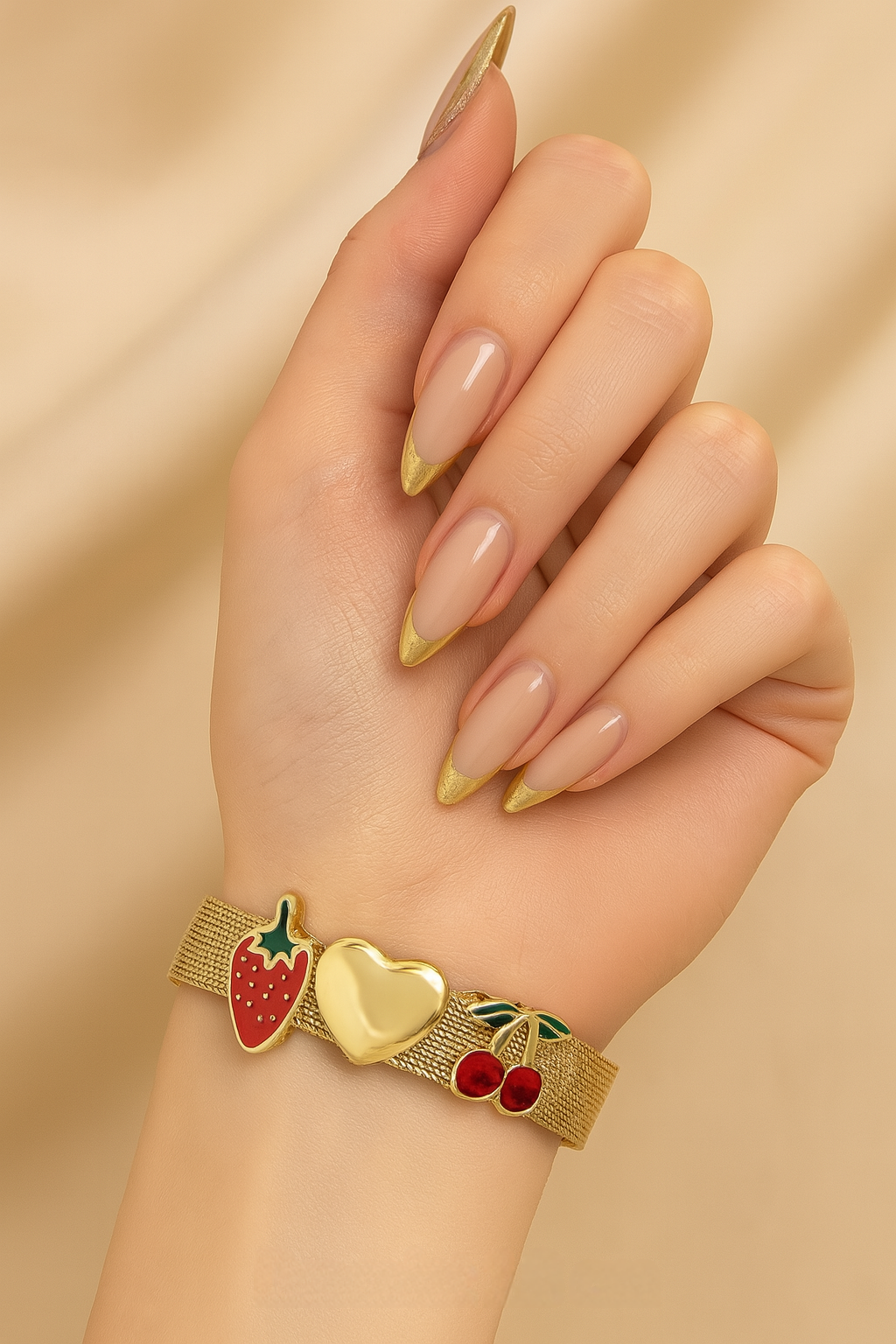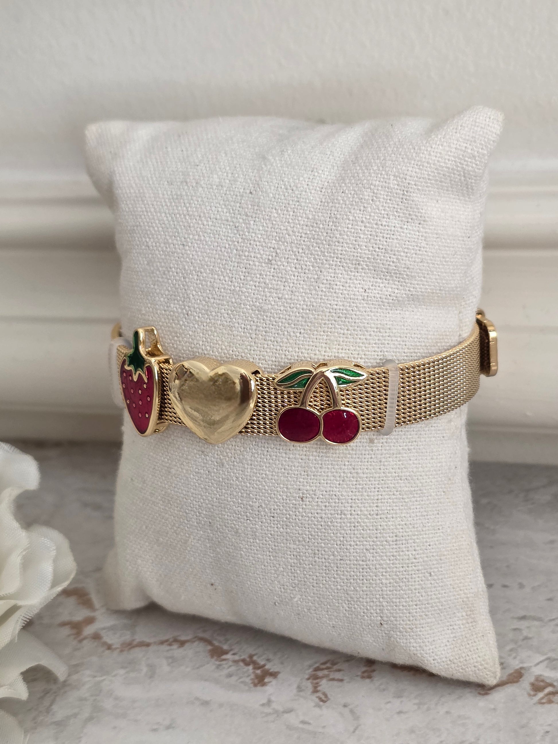 Add a fruity pop to your wrist with this adorable charm bracelet featuring a strawberry, golden heart, and sweet cherry enamel charms. Set on a luxe adjustable gold mesh band, it’s the perfect mix of playful and pretty. Stack it or wear it solo — either way, it’s a total vibe! 💖