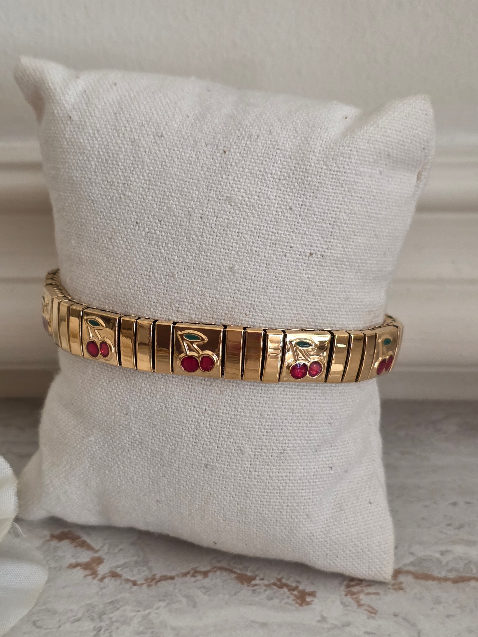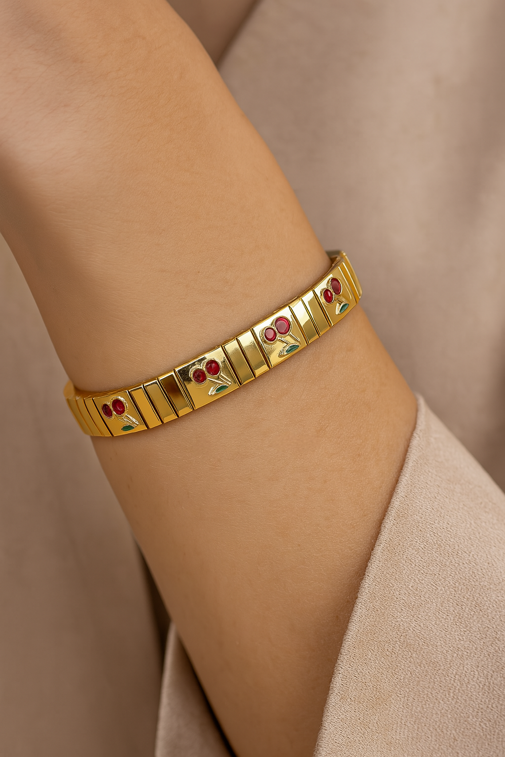 Add a playful yet elegant touch to your style with this stunning gold cherry bracelet. Featuring a sleek, polished gold-tone finish with vibrant cherry motifs, it’s perfect for everyday wear or layering with other pieces.