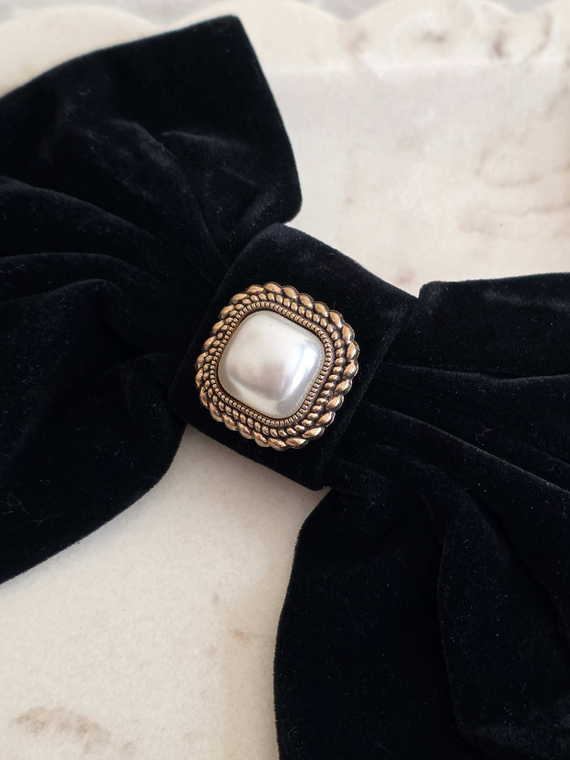 Elevate your hairstyle with timeless sophistication. This handmade black velvet bow hair clip features a refined, structured shape with a plush finish that exudes elegance. At the center, a vintage-style faux pearl framed in an antique gold rope setting adds a graceful, feminine touch. Ideal for adding a dash of charm to both casual and formal looks.
