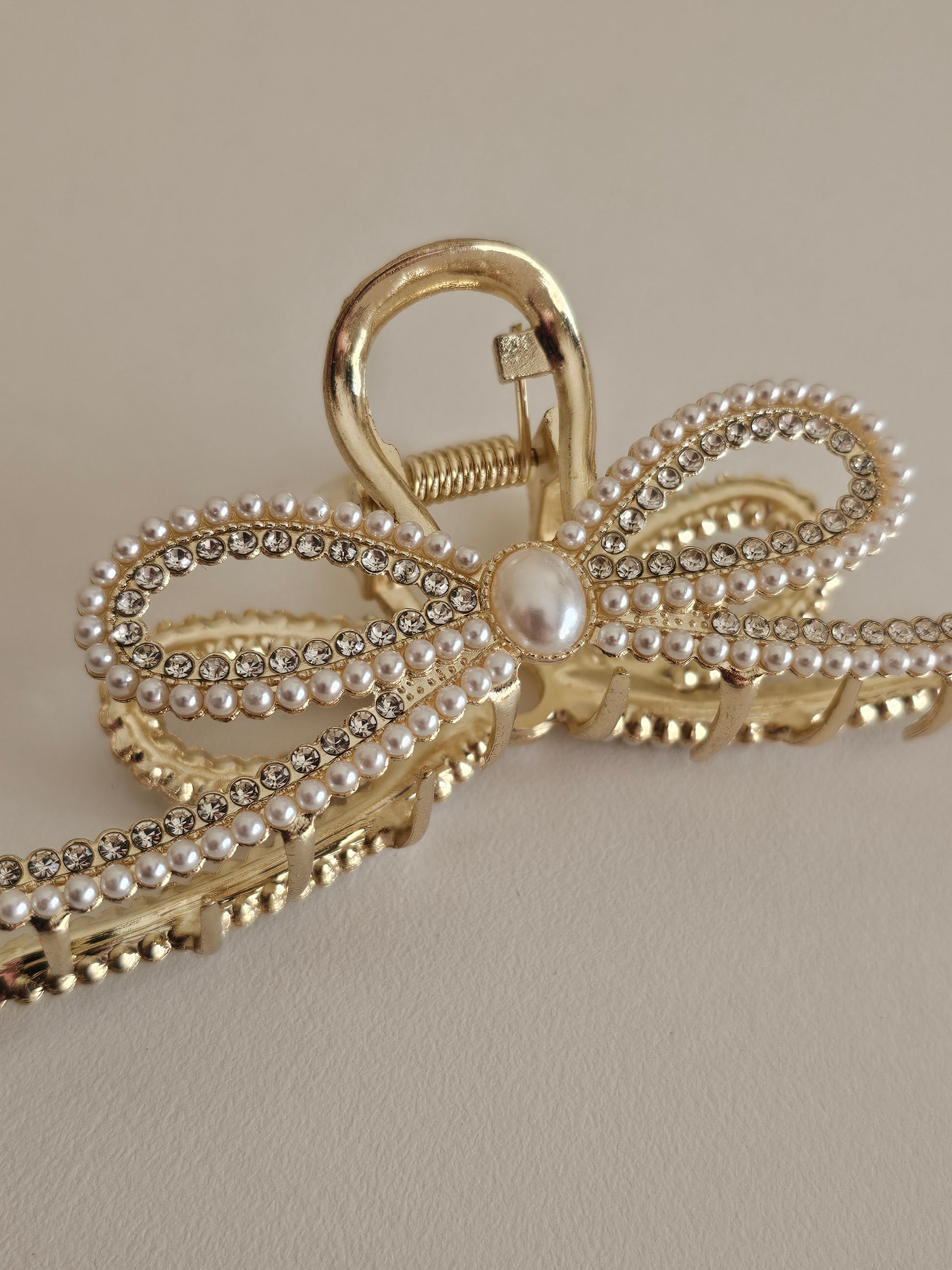 Add a touch of glamour to your hairstyle with this elegant gold bow hair claw, embellished with sparkling rhinestones and dainty pearls. The center features a pearl accent that completes the luxurious design. Perfect for adding charm to both casual and formal looks.
