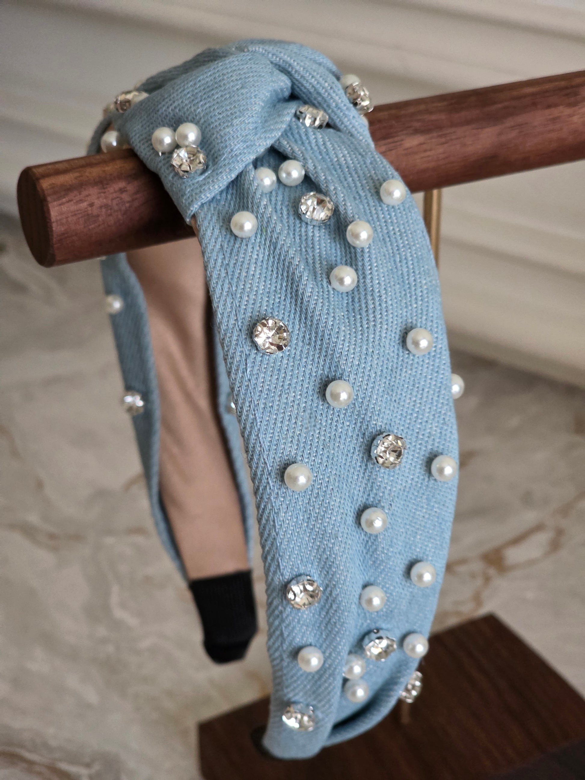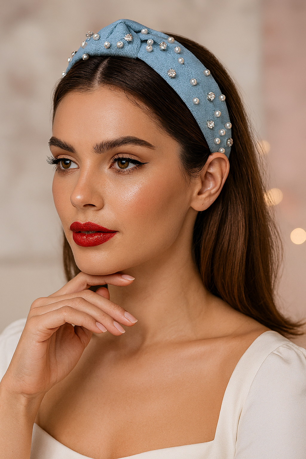 Elevate your everyday look with this chic denim headband adorned with sparkling diamantes and classic pearls. The knotted design adds a trendy twist, while the mix of shimmer and texture makes it the perfect accessory to dress up casual outfits or add glam to a night out. Comfortable to wear and beautifully detailed — a must-have statement piece for any accessory collection.