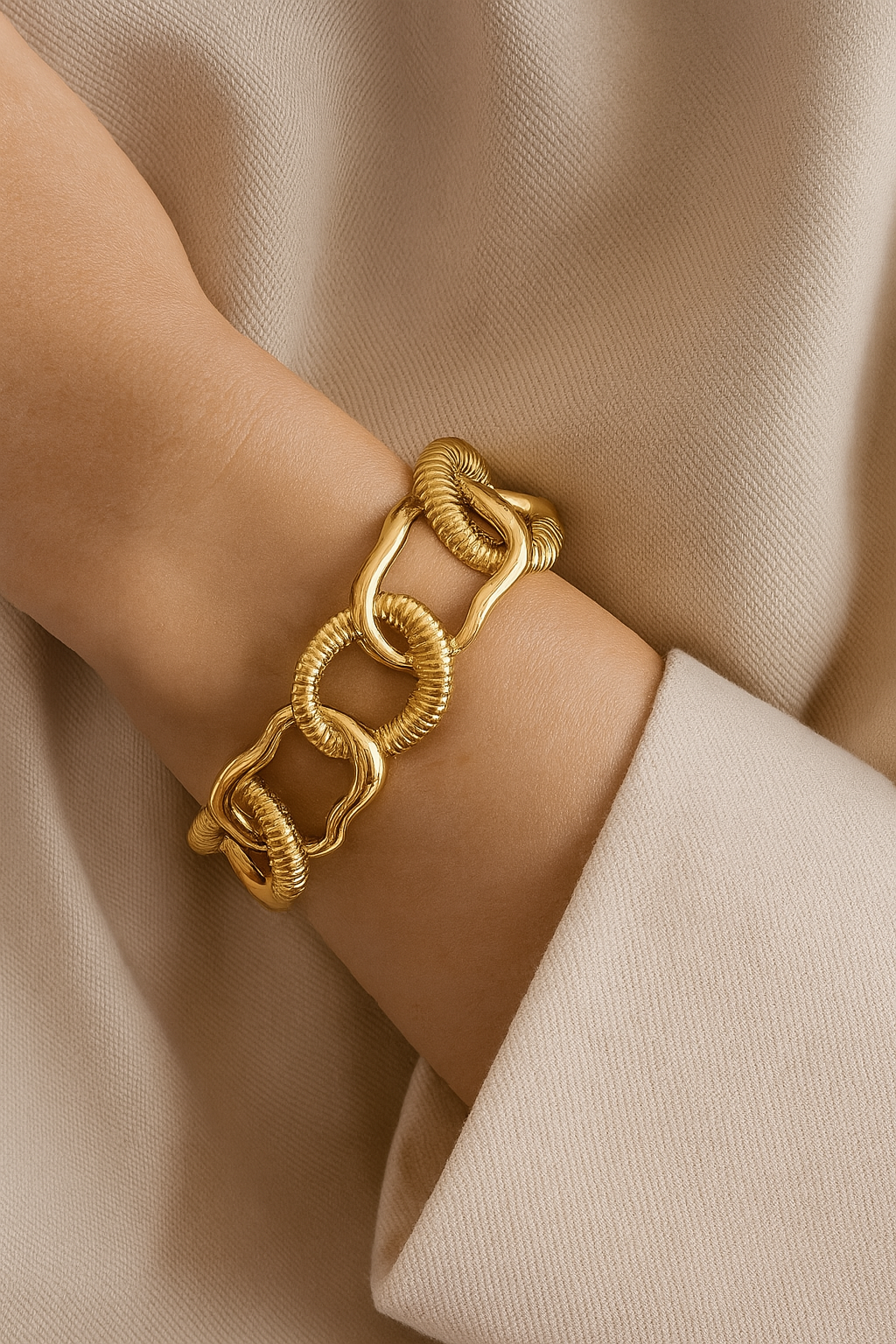 Elevate your style with this bold and sophisticated gold cuff bangle. Featuring oversized, textured interlocking links with a smooth, organic finish, this piece beautifully combines modern elegance with a touch of vintage charm. Crafted from high-quality stainless steel with a luxurious gold plating, it’s waterproof, tarnish-resistant, and designed for everyday wear. Perfect for stacking or making a statement on its own, this bangle effortlessly transitions from casual chic to evening glamour.