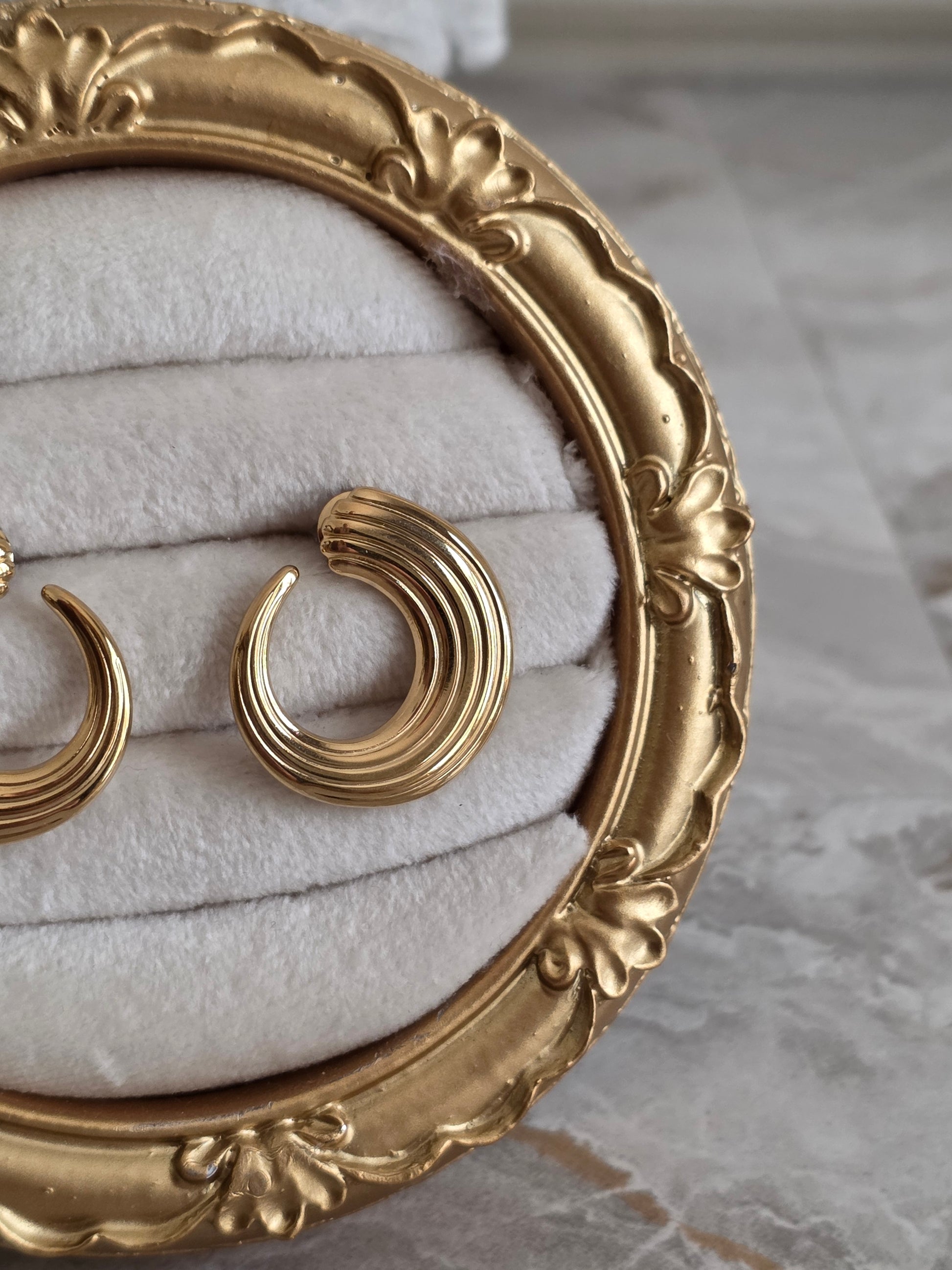 Crafted with a layered, ripple-like design in 18K gold-plated stainless steel, these earrings add a touch of texture and dimension to any look. Their open crescent shape makes them lightweight, comfortable, and perfect for daily wear or elegant evenings out.