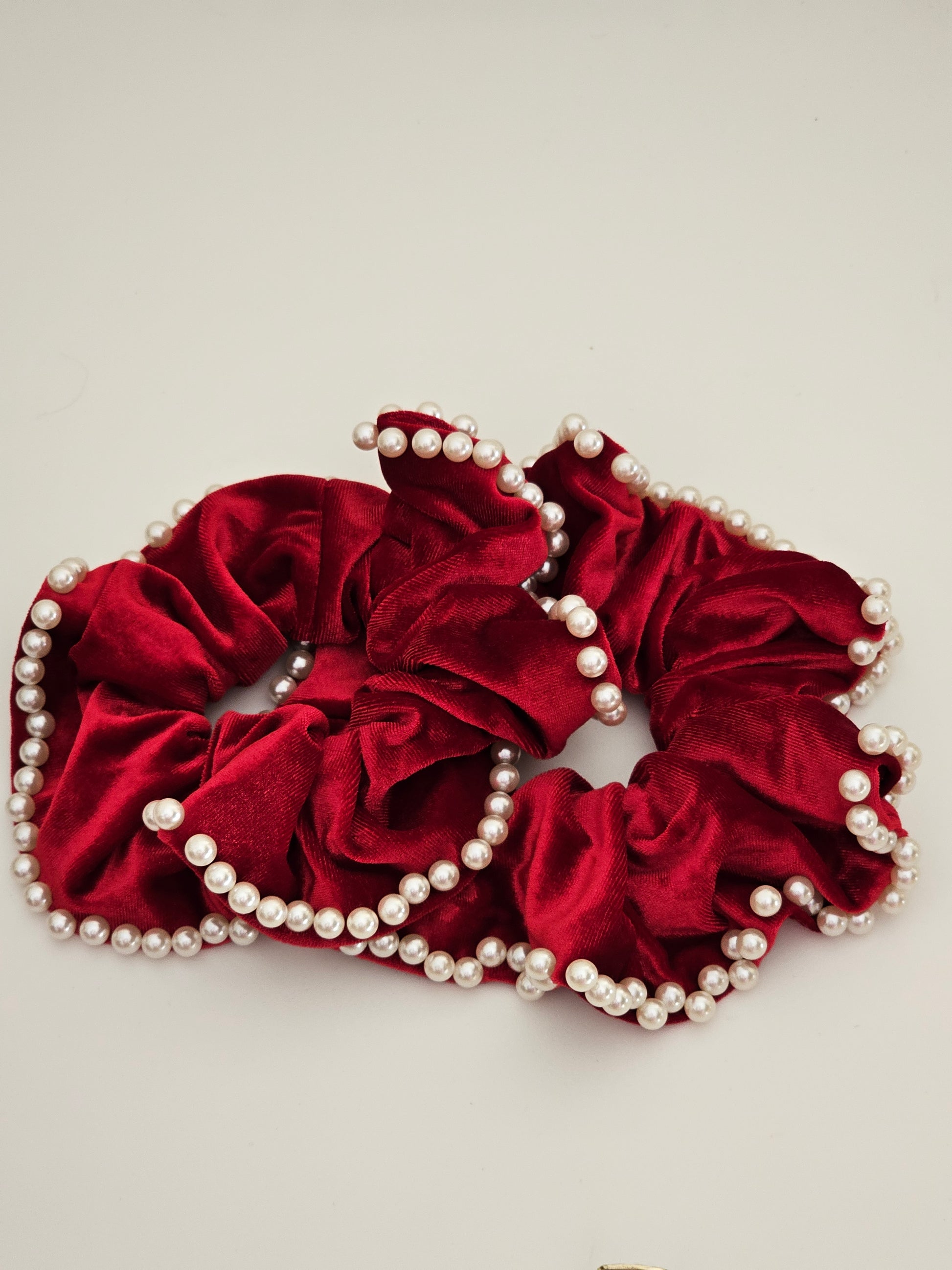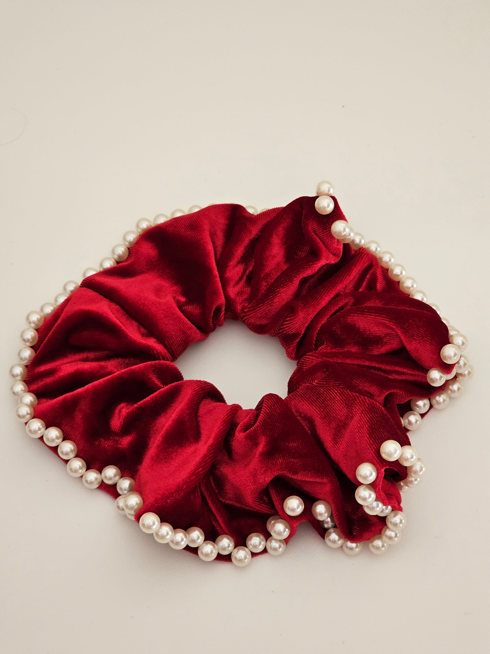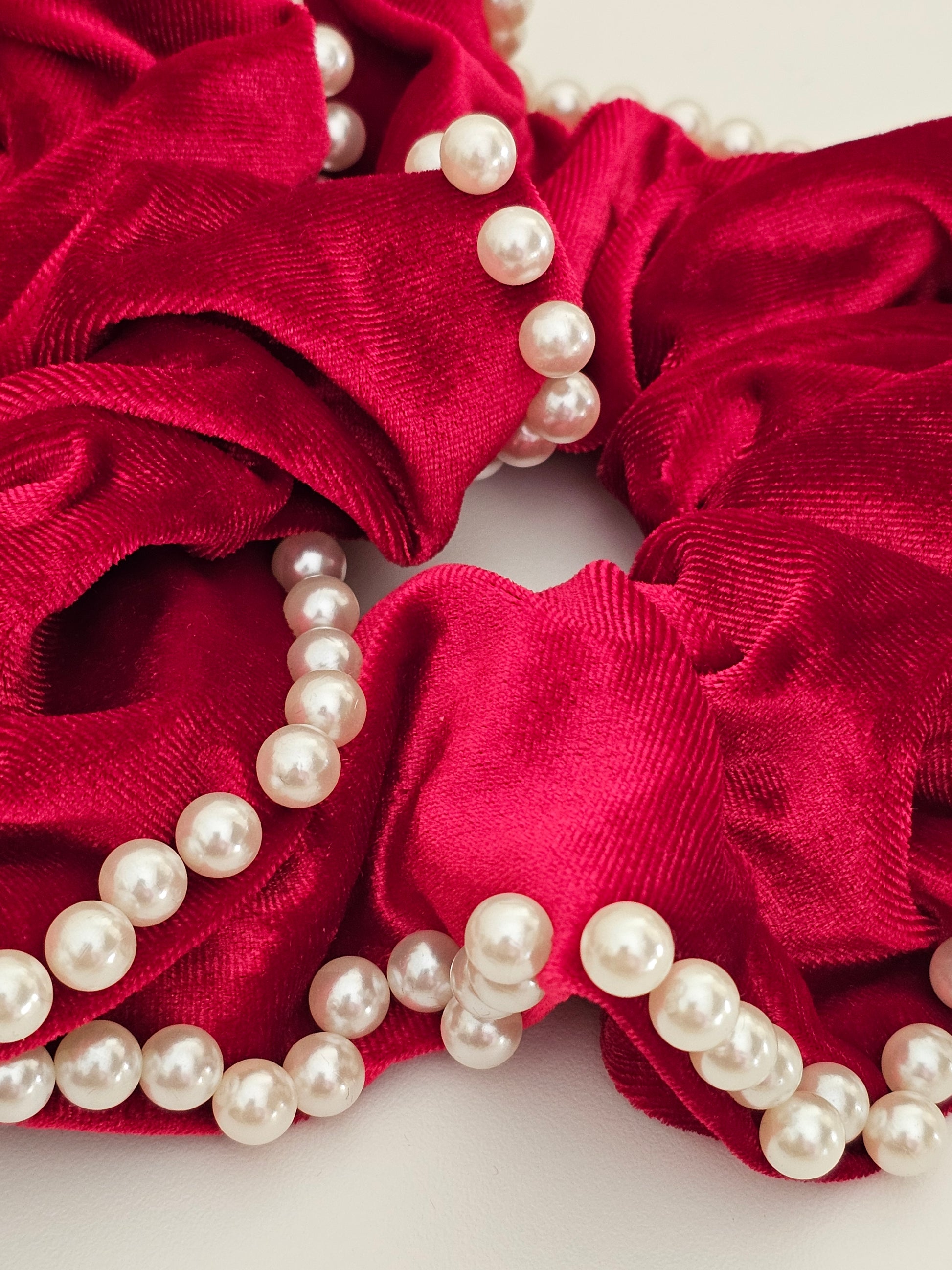 1 x Oversized lux red velvet pearly hair scrunchie.
