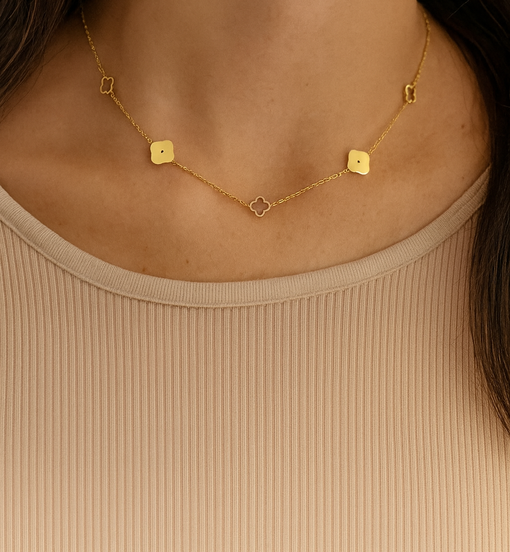 A delicate gold-tone chain adorned with alternating clover motifs in smooth polished gold and enamel finishes. Each charm showcases a timeless quatrefoil design, symbolizing luck and sophistication. Lightweight and versatile, this necklace adds a touch of understated luxury to both casual and formal looks.