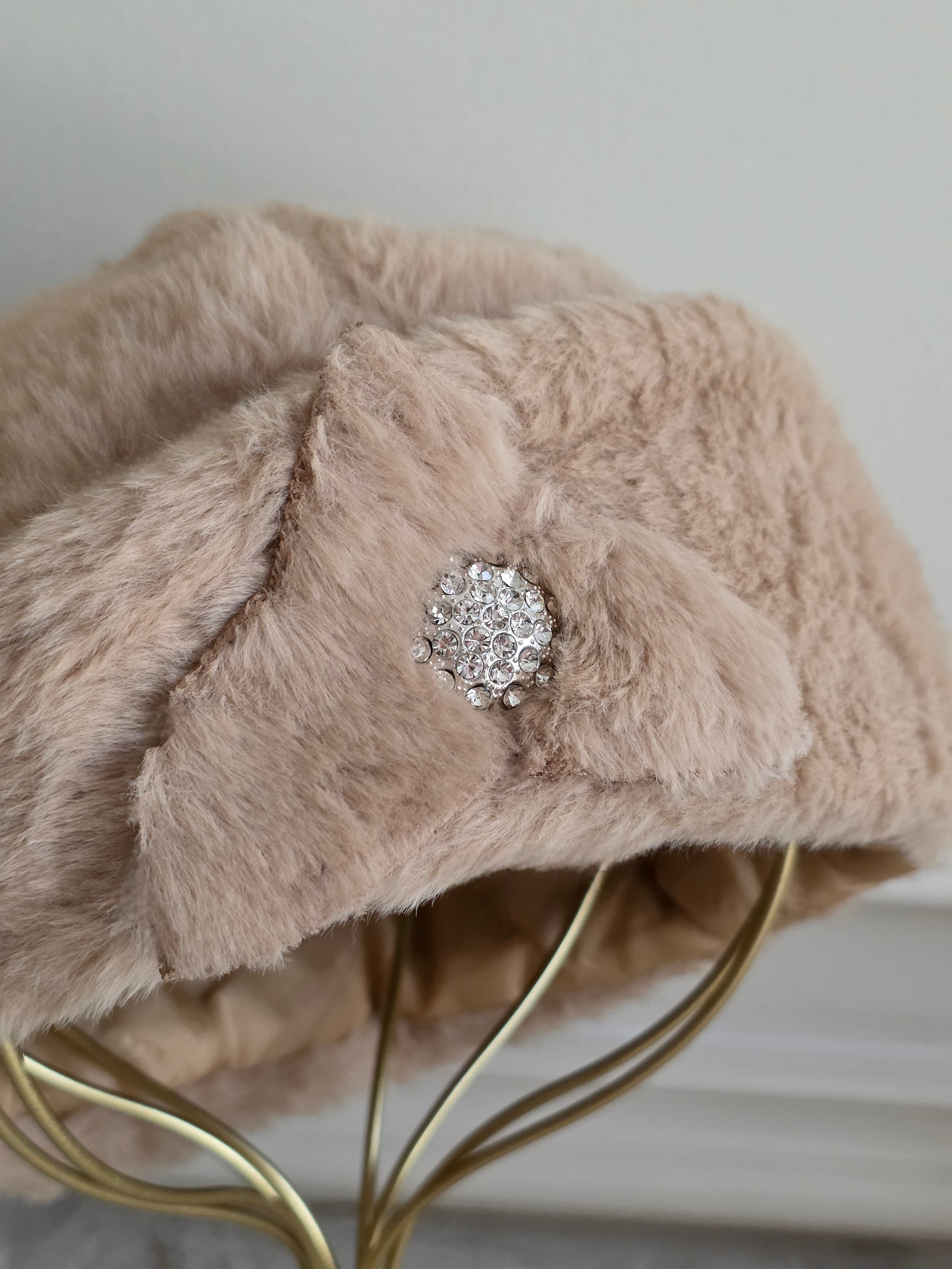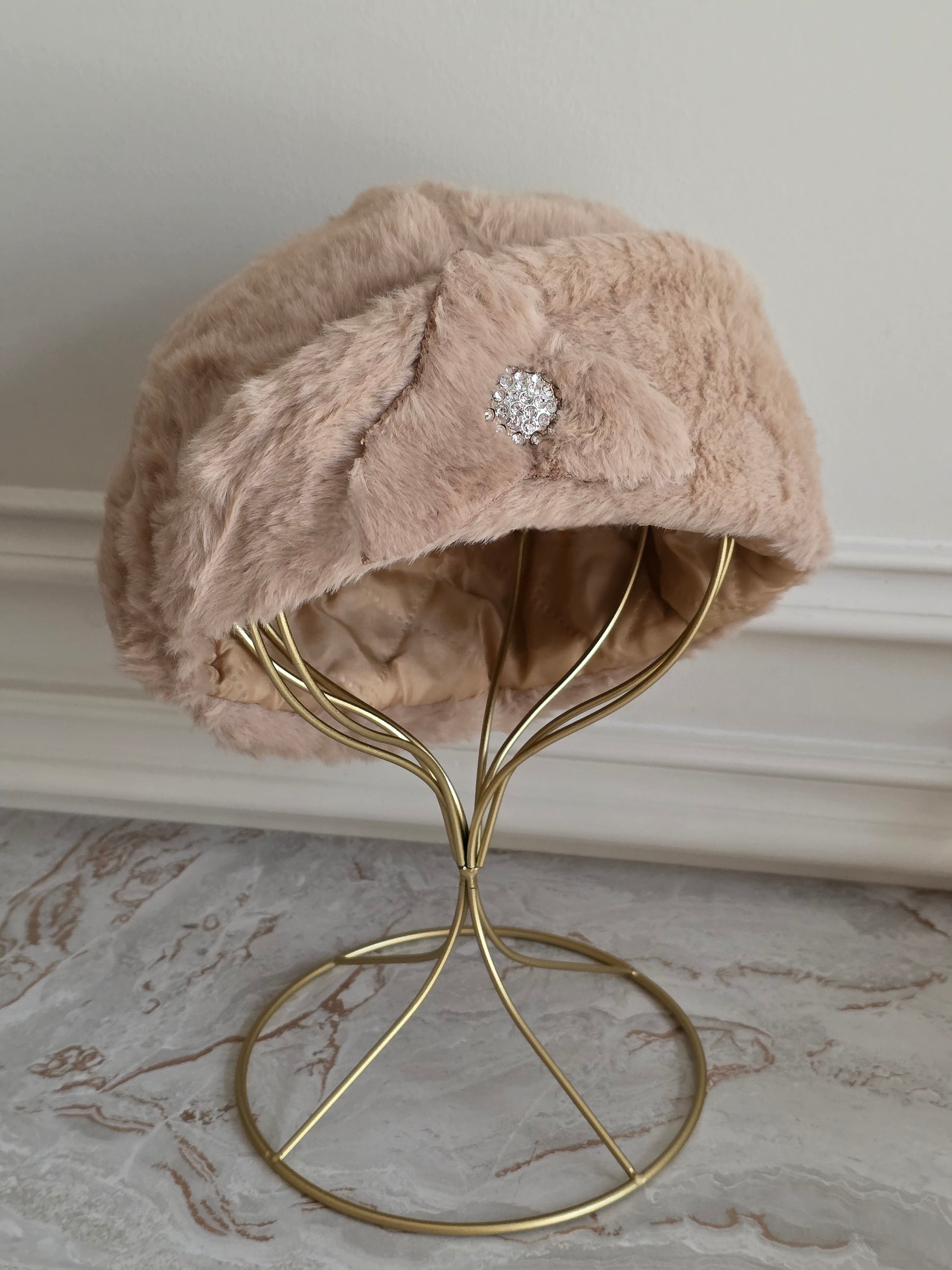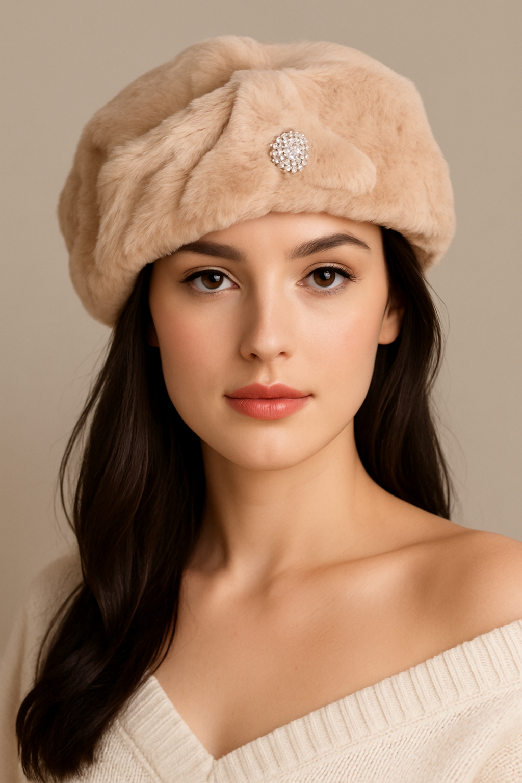 Wrap yourself in winter luxury with this plush beige faux fur beret, designed to keep you cozy and chic. Soft to the touch and fully lined for comfort, it features a sparkling crystal embellishment for that perfect touch of glam. One size fits most, making it an effortless addition to any winter wardrobe.