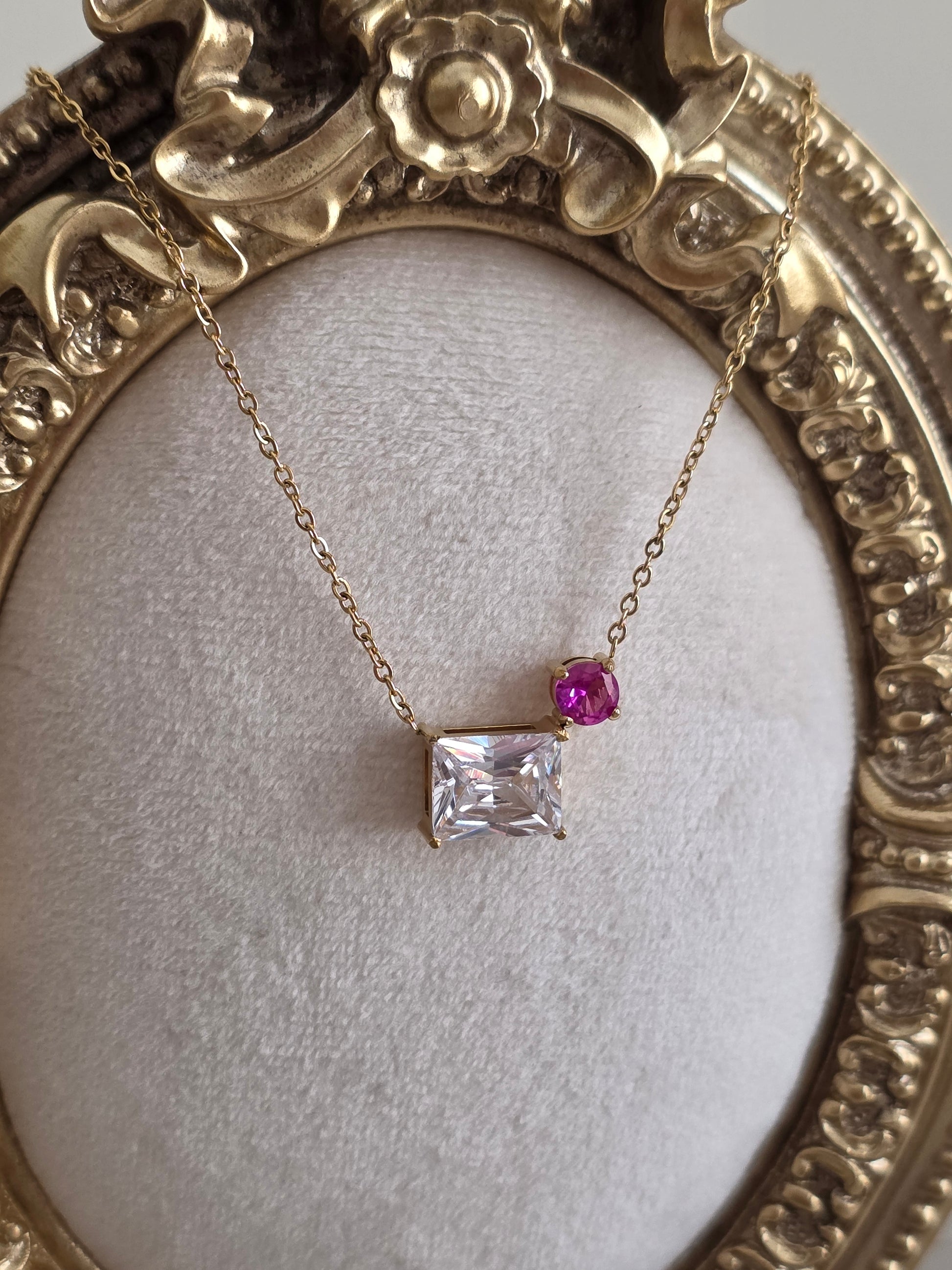 A blend of elegance and modern charm, our Radiant Duo Necklace features a stunning square-cut cubic zirconia stone paired with a vibrant pink gemstone for a subtle pop of color. The asymmetrical design adds a contemporary twist to a timeless classic, making it perfect for both everyday wear and special occasions.