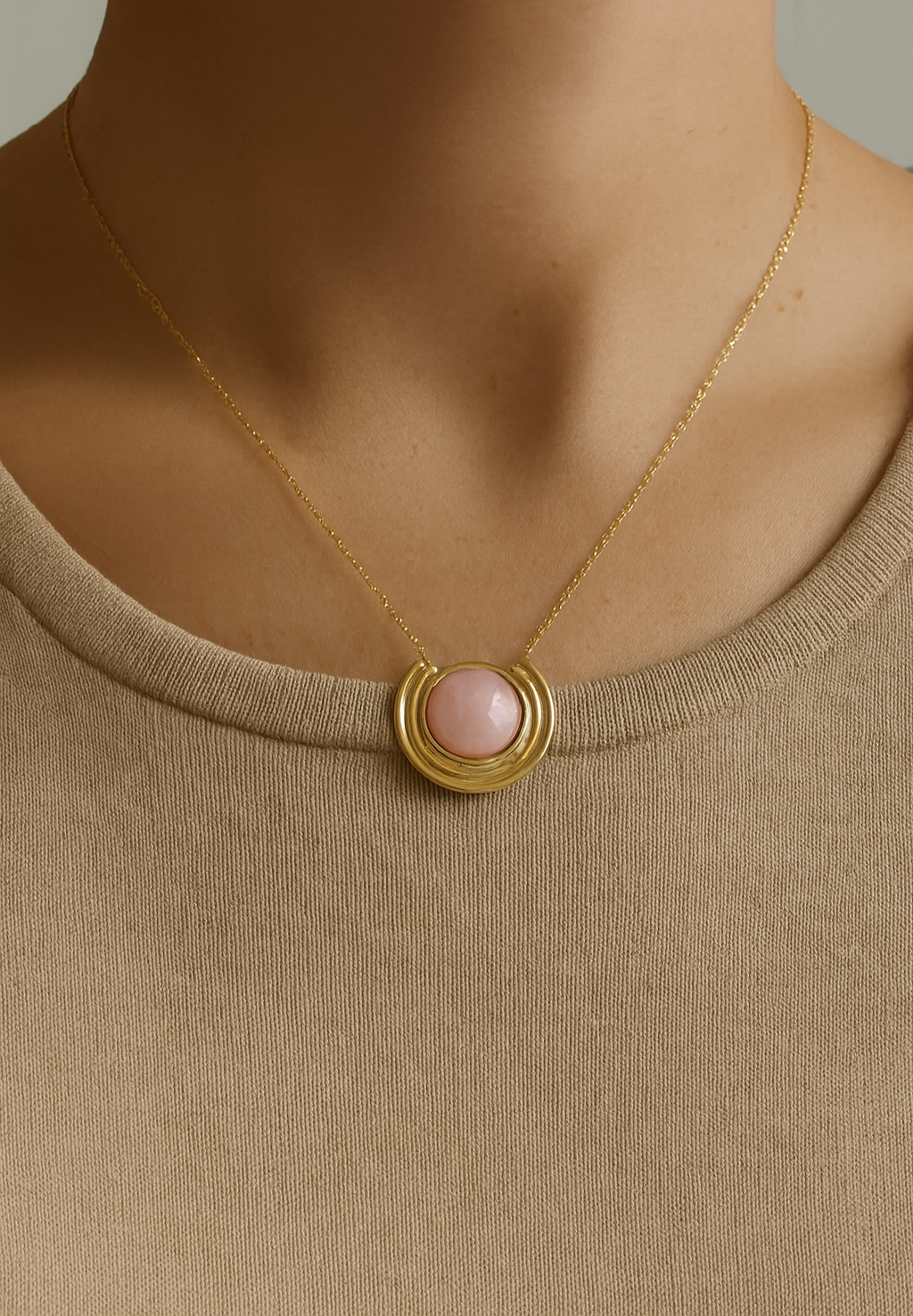 Elevate your style with this elegant gold-plated statement necklace, featuring a smooth, soft pink stone at its center. The circular pendant is framed by sleek, layered gold rings, creating a modern yet timeless design. Its delicate chain adds a touch of sophistication, making it perfect for both casual and formal looks. Lightweight and versatile, this necklace is an ideal piece to enhance any outfit.