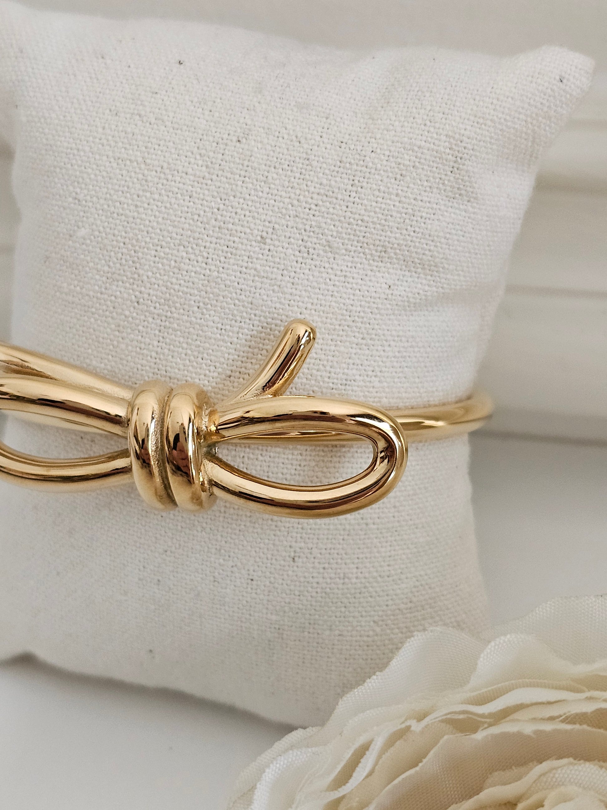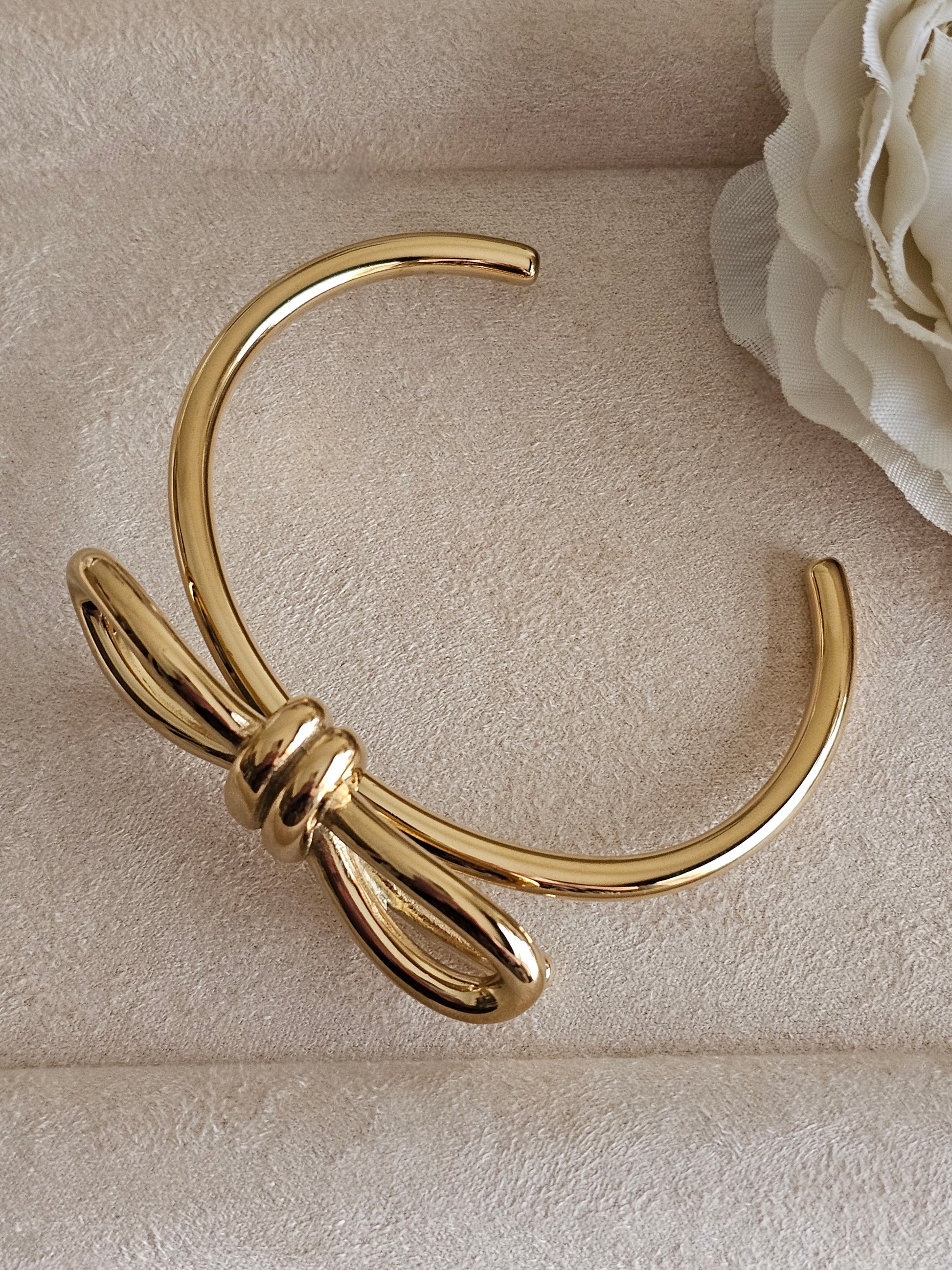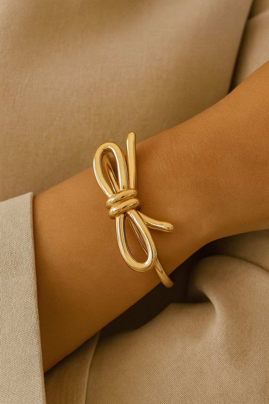 Delicate yet striking, this gold-tone cuff bangle features a chic bow design that adds a touch of playful elegance to any outfit. Its smooth, polished finish enhances the fluid curves of the bow, creating a timeless accessory that’s perfect for both everyday wear and special occasions. Lightweight and adjustable for a comfortable fit, it’s a must-have piece for effortless feminine charm.