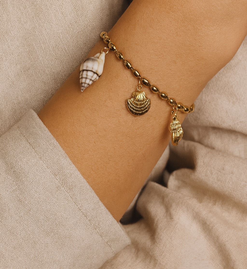 Embrace coastal elegance with our Seaside Charm Shell Bracelet. This stunning piece features a string of polished, gold-toned oval beads adorned with four delicate sea-themed charms: a natural spiral shell, starfish and two intricately detailed gold shell pendants. Perfectly balancing organic and luxe elements, this bracelet evokes the spirit of summer by the sea.