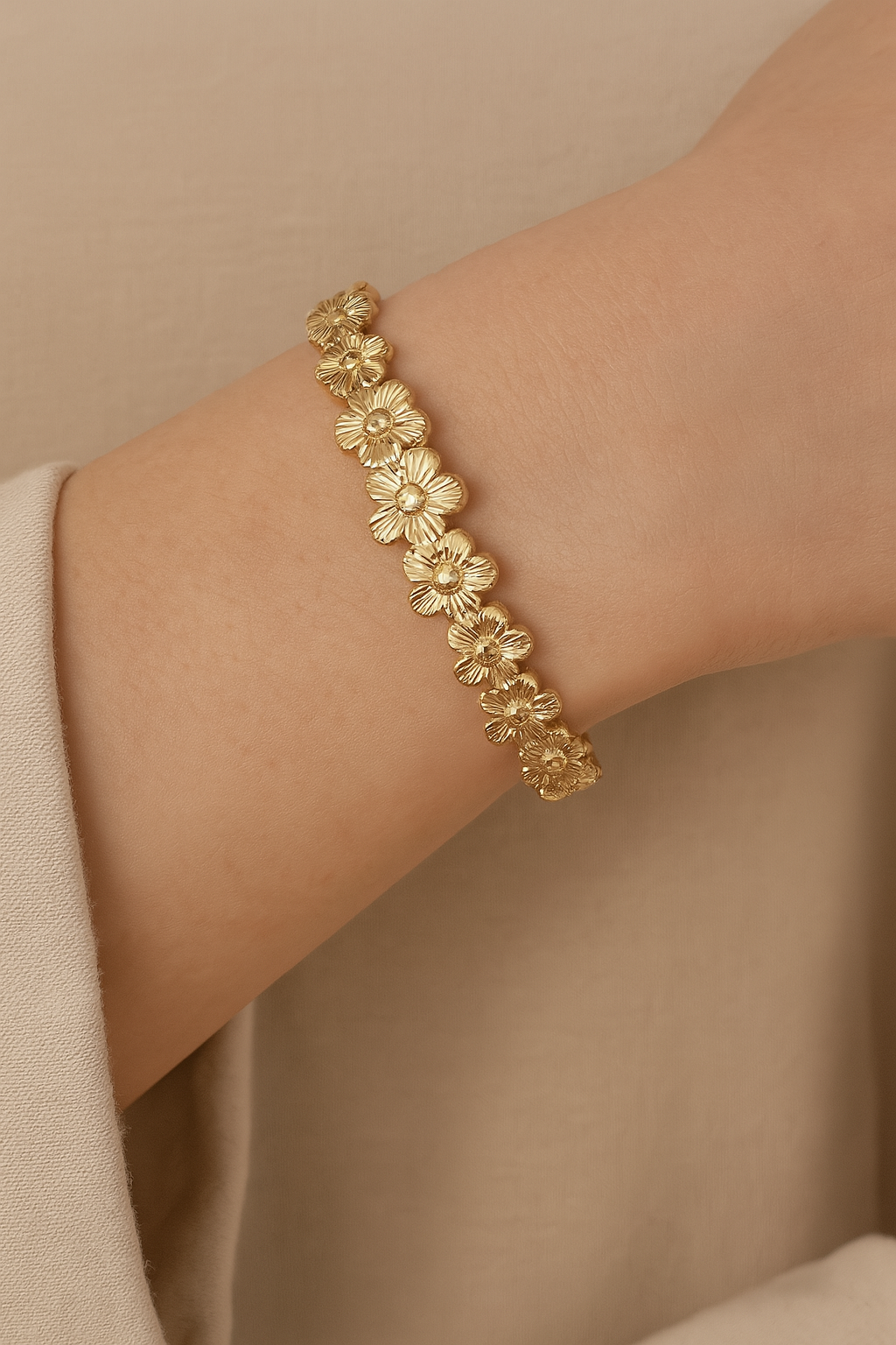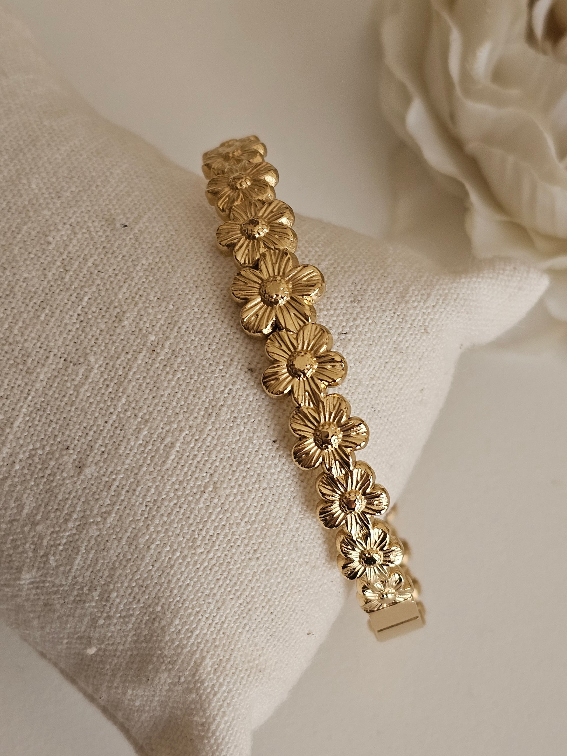 Embrace effortless elegance with this charming gold-plated bangle, featuring a row of intricately detailed daisy flowers. Each petal is finely textured, creating a soft yet radiant shine that catches the light beautifully. Perfect for stacking or wearing solo, this floral-inspired piece adds a touch of femininity and timeless style to any outfit. Lightweight and comfortable, it’s ideal for both everyday wear and special occasions.