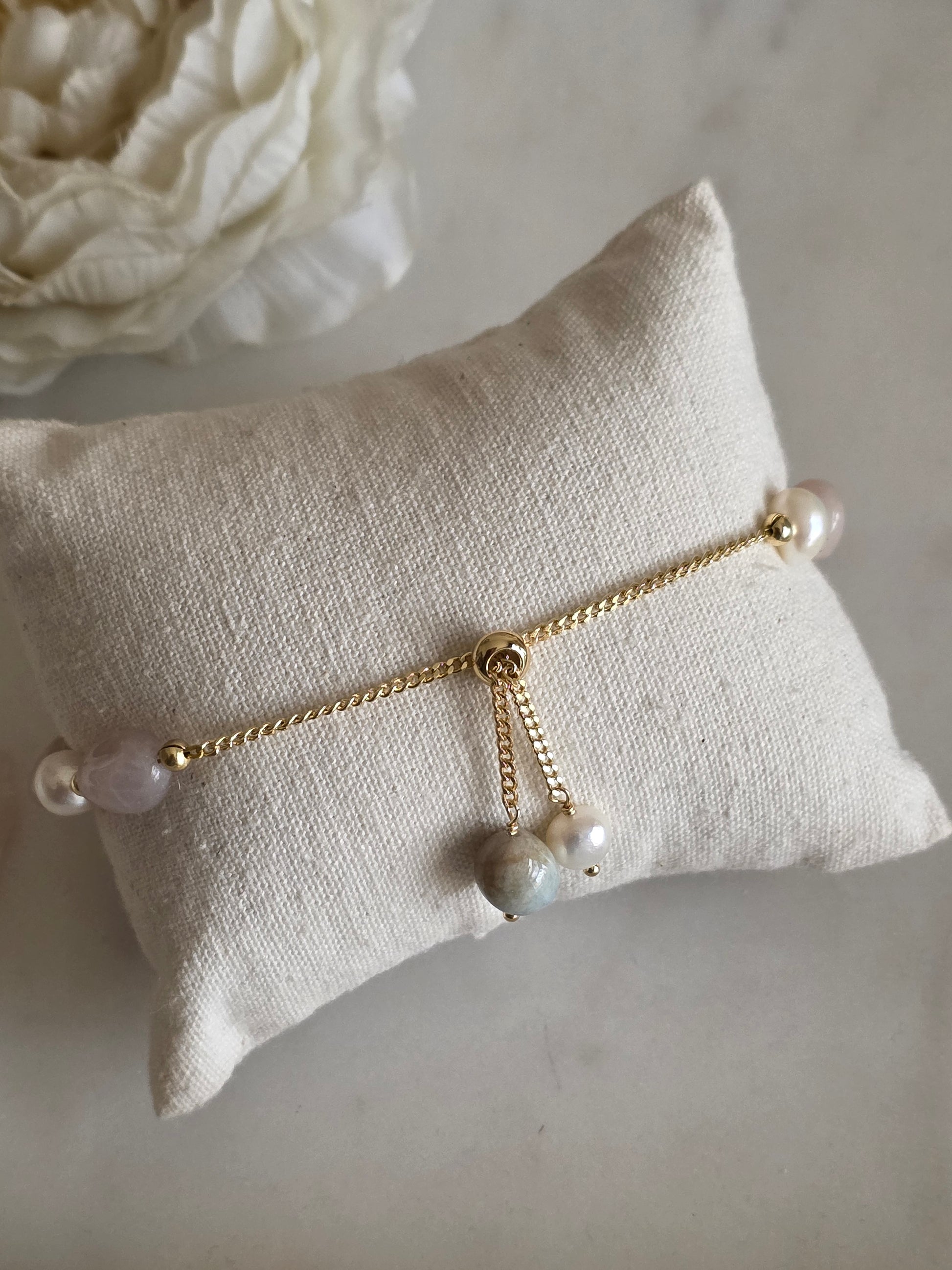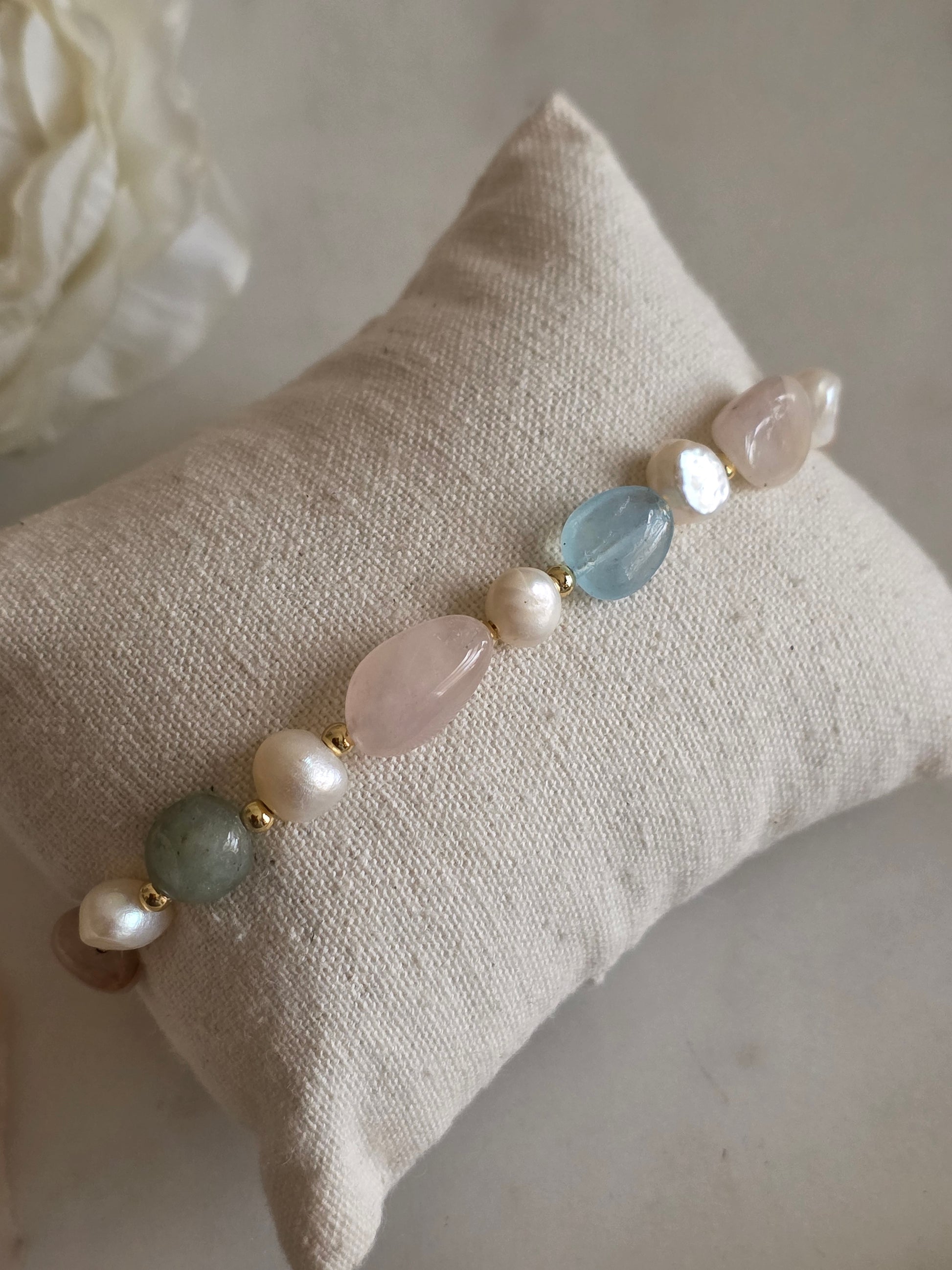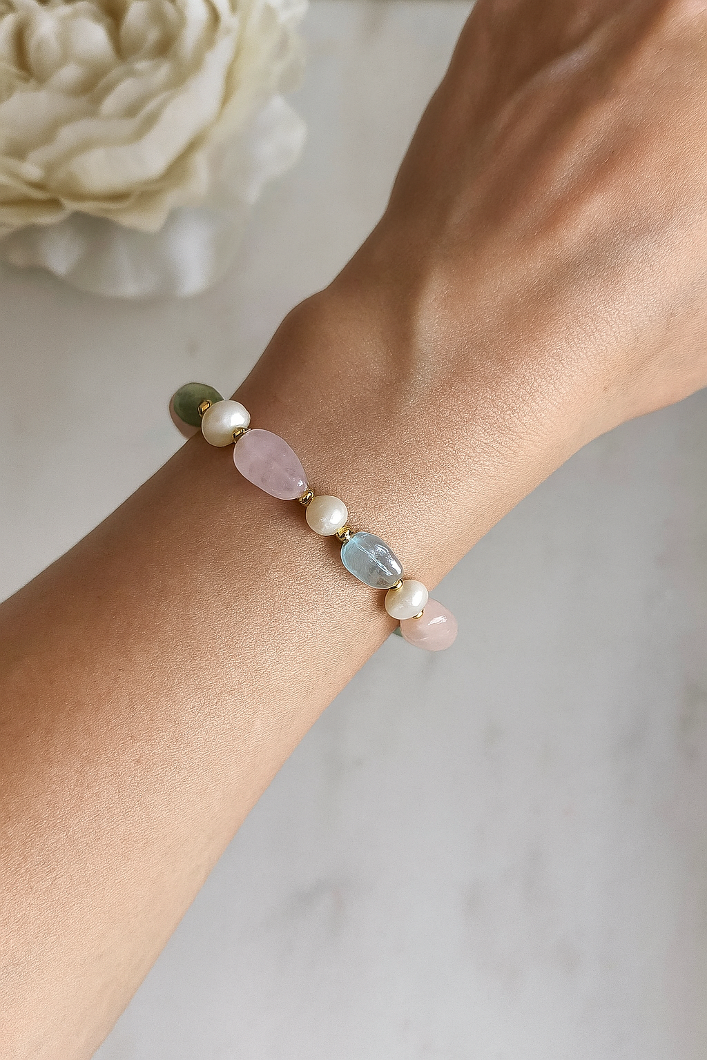 A timeless piece that blends soft, soothing tones with natural elegance. Featuring polished natural stones in delicate pastel hues, lustrous freshwater pearls, and subtle gold-tone accents, this bracelet is perfect for adding a serene, sophisticated touch to any outfit