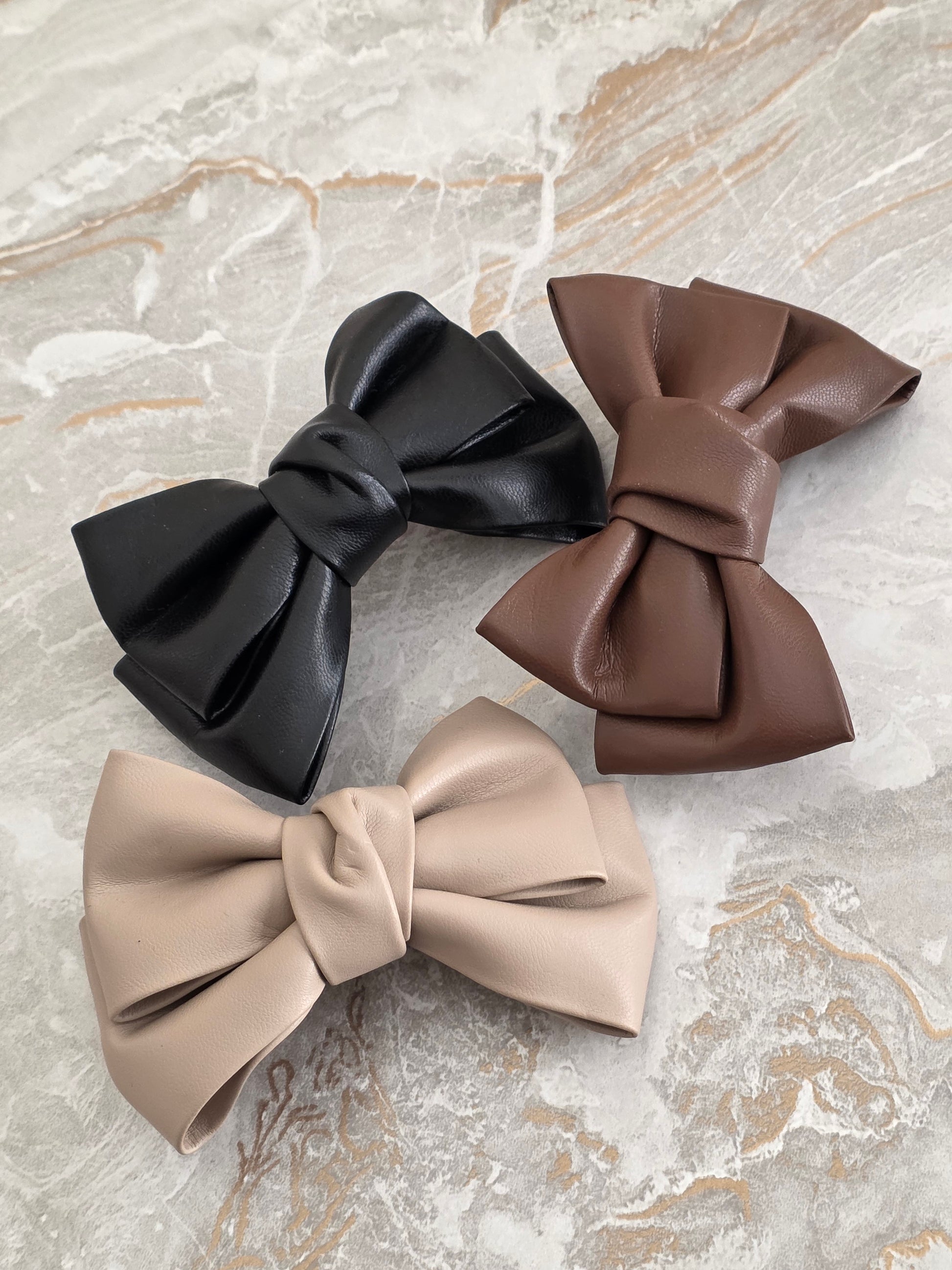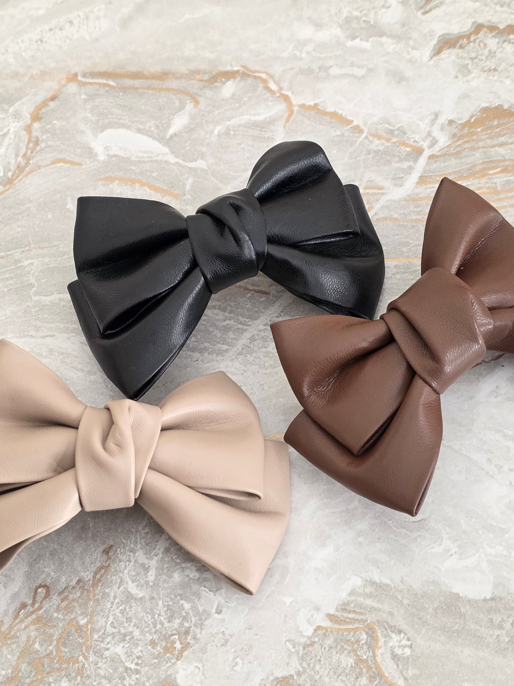 Add a touch of modern elegance to your look with our Classic Faux Leather Bow Hair Clips. Handcrafted with smooth, high-quality faux leather, these structured bows bring a sleek and sophisticated edge to any hairstyle. Available in versatile shades of black, mocha brown, and soft beige to suit every outfit.