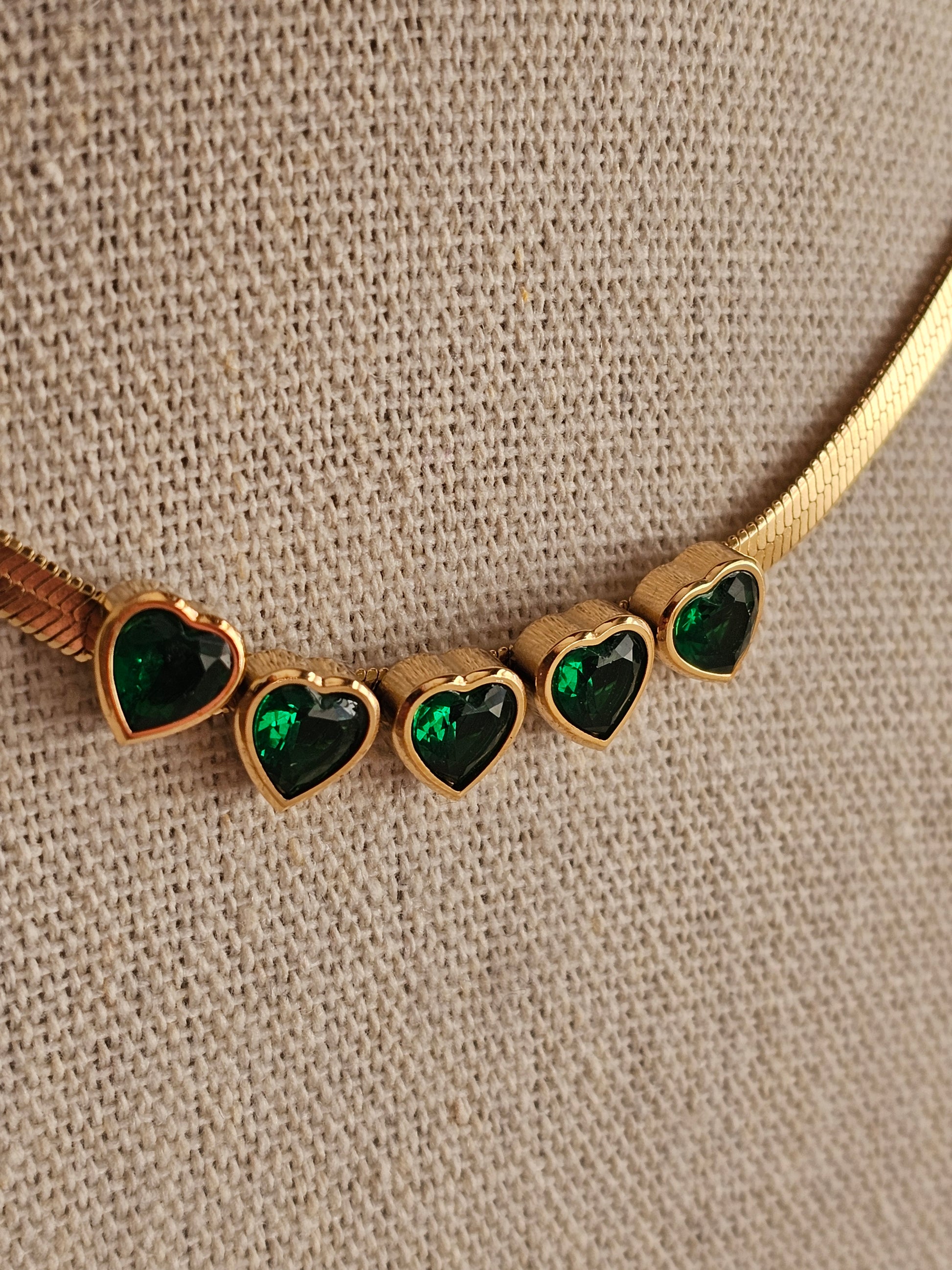Add a touch of romance and elegance with this gold-plated herringbone chain necklace, featuring five dainty emerald-green heart charms. The rich green stones shimmer beautifully, creating a sophisticated yet playful look that’s perfect for layering or wearing solo.