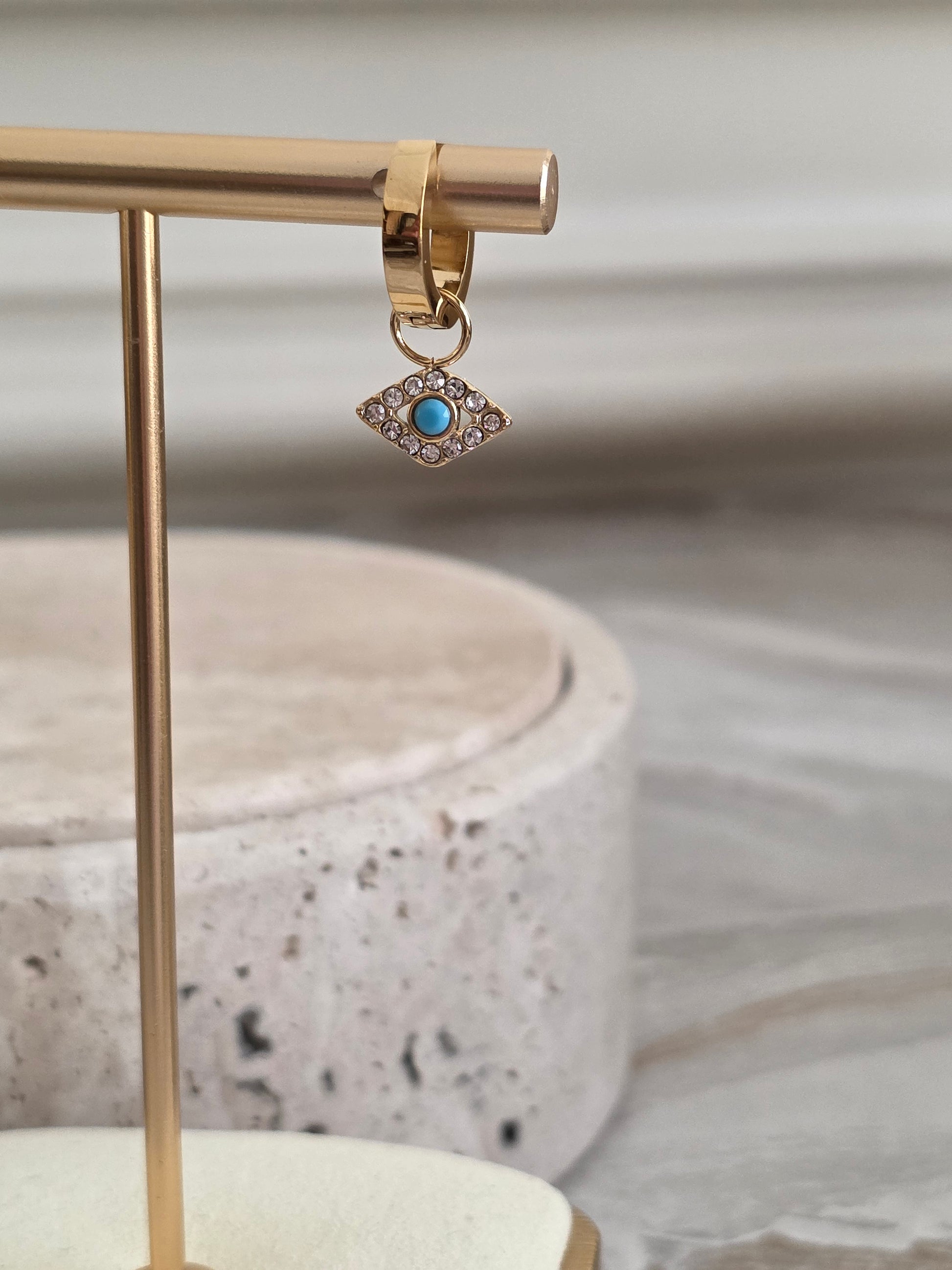 Add a touch of charm with our Gold Turquoise Evil Eye Huggie Earrings. These stunning earrings feature a turquoise center surrounded by sparkling cubic zirconia, set on a sleek gold huggie hoop.