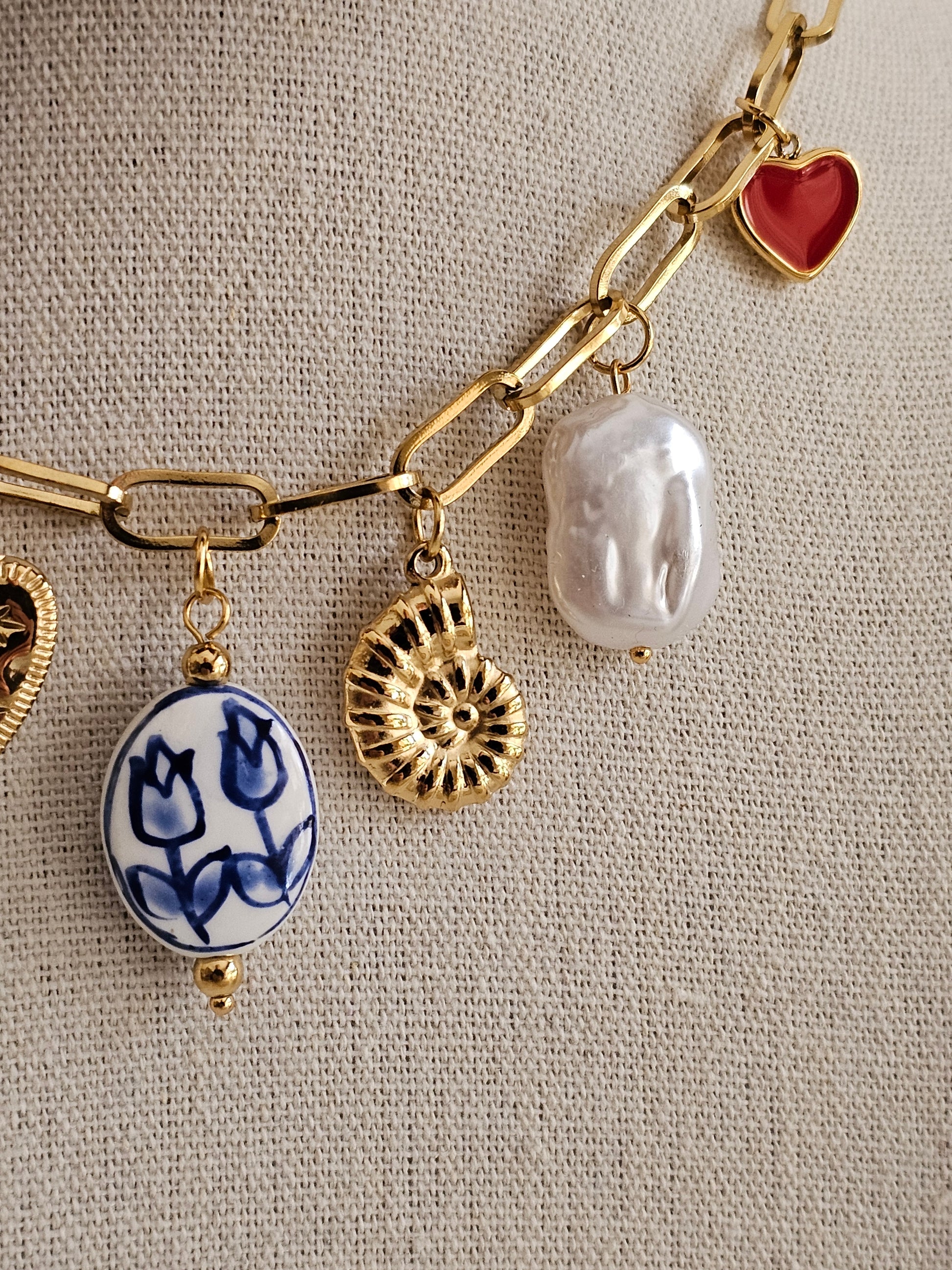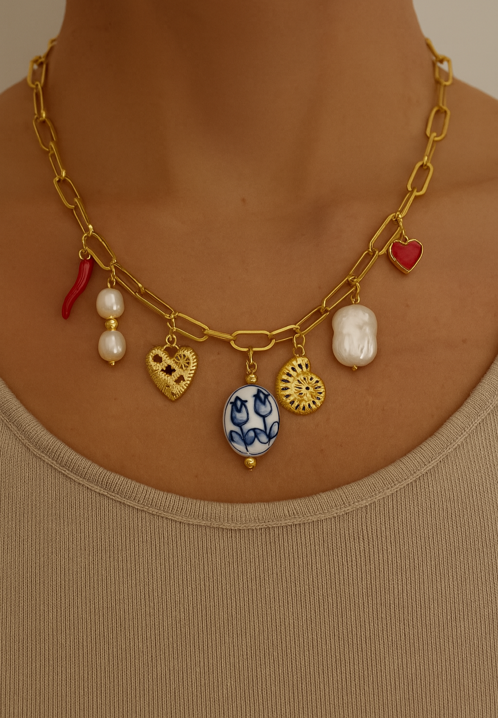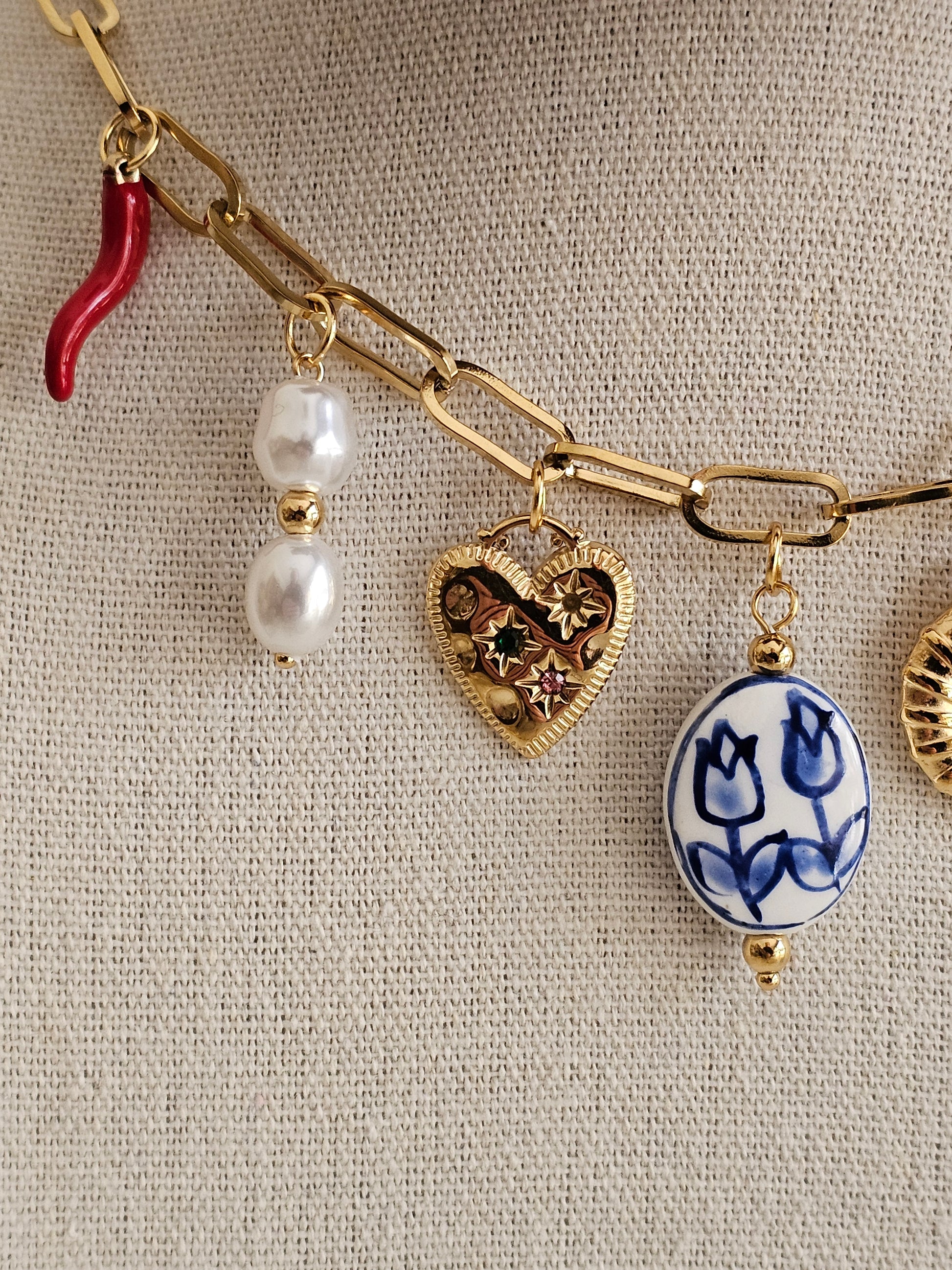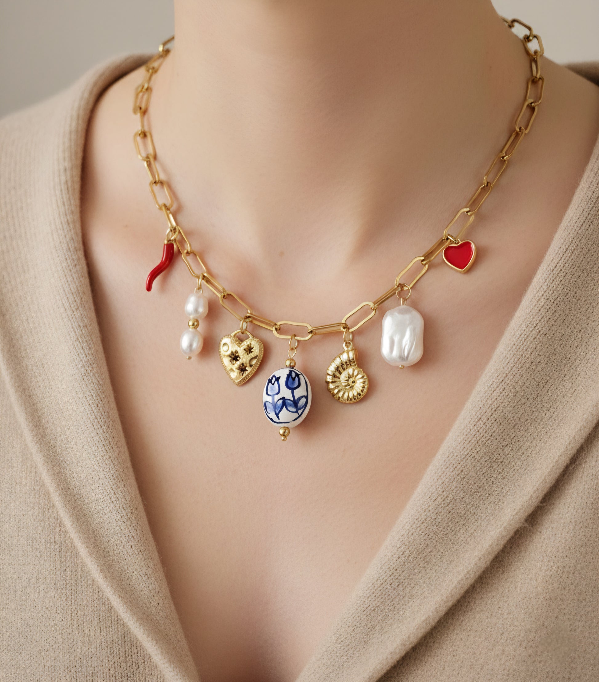 Add charm to your style with this statement necklace, featuring a bold gold-toned chain adorned with a unique collection of eclectic pendants. Each charm tells its own story — from a delicate red chili and dainty freshwater pearls to a detailed golden heart, a tulip-painted porcelain bead, and radiant shell and spiral motifs. Finished with a pop of red from the enamel heart, this necklace blends whimsy and elegance for a truly eye-catching look. Perfect for layering or wearing solo, it’s your go-to piece for effortless statement styling.