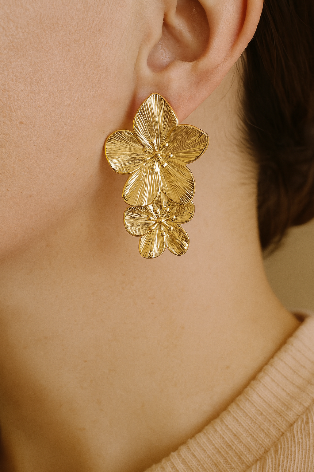 Elevate your style with these stunning Golden Blossom Statement Earrings. Featuring a cascading double-flower design with delicately textured petals, these earrings exude elegance and sophistication. Crafted with a radiant gold finish, they catch the light beautifully, adding a touch of luxury to any look. Lightweight yet bold, they are perfect for special occasions or making an everyday outfit feel extraordinary.
