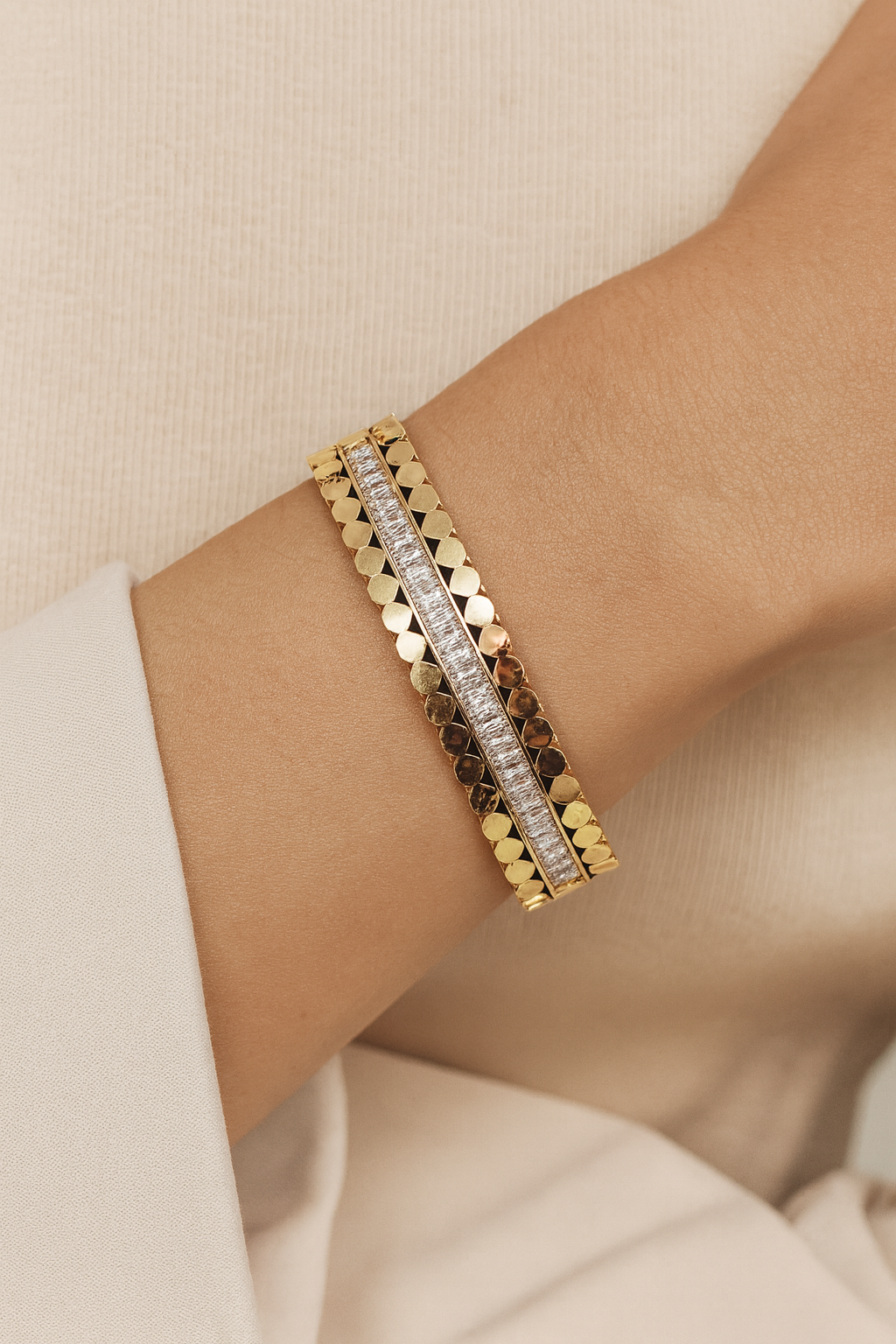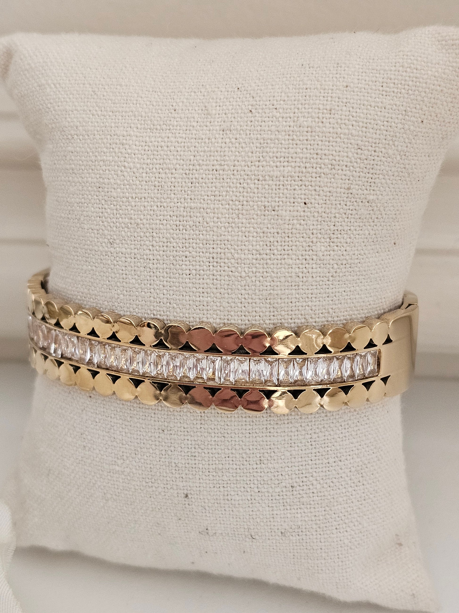 Bangle Size: Inner diameter 5.9 cm. Has a clasp that opens for an easy effortless fit.