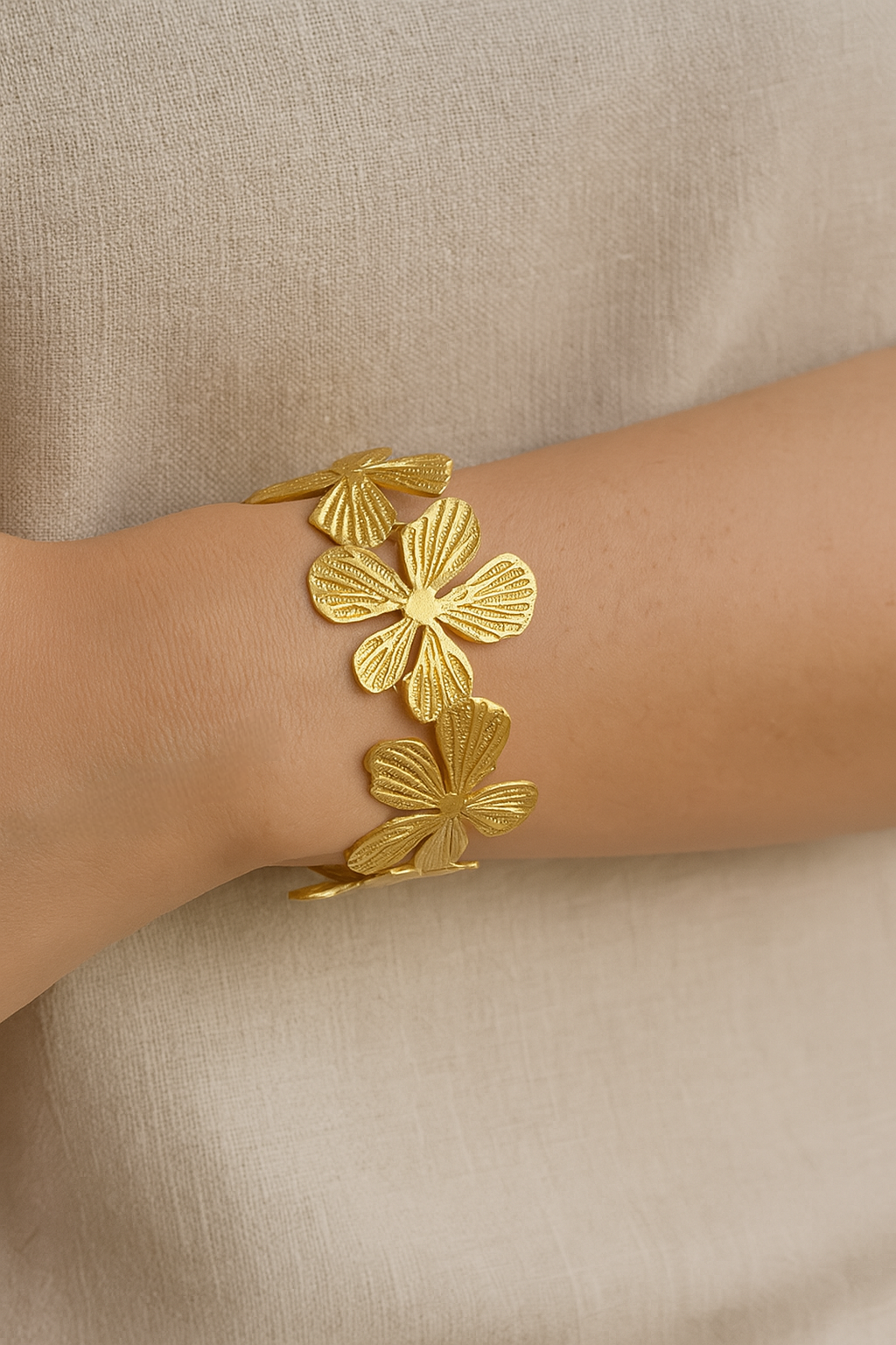 Embrace timeless elegance with this exquisite flower cuff bangle. Featuring delicately sculpted blossoms with intricate petal detailing, this gold-toned piece captures the beauty of nature in a modern, sophisticated design. Lightweight yet durable, it slips on effortlessly and adds a graceful touch to any outfit. Perfect for both everyday wear and special occasions, it’s a statement piece that radiates femininity and charm.