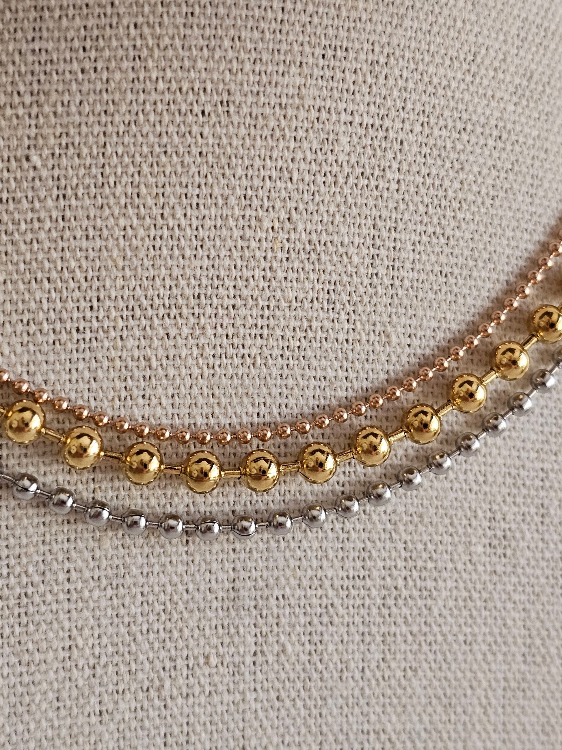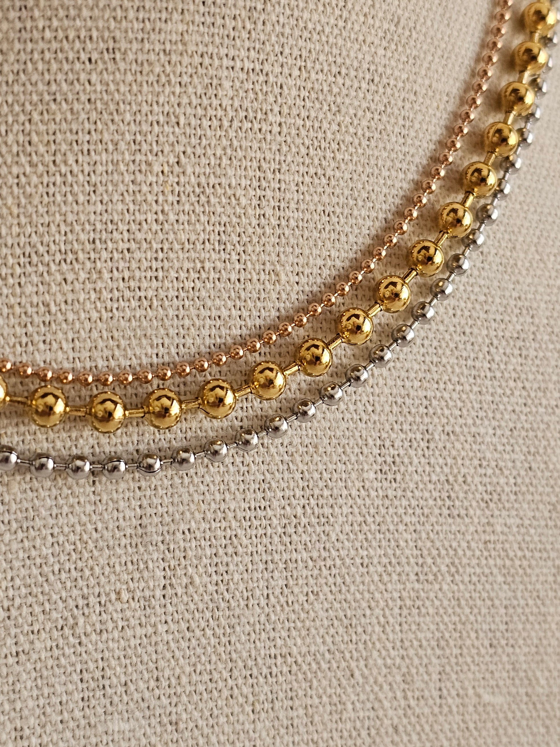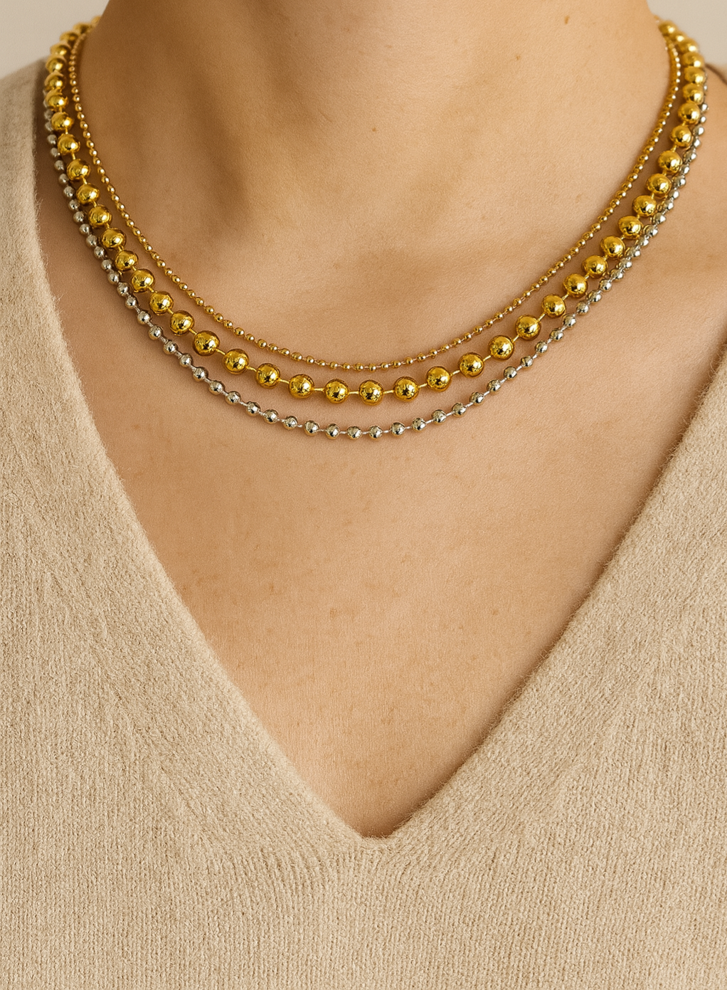 This stunning necklace features a sophisticated triple-layer design with polished gold and silver beads, creating a timeless and versatile piece. The gold beads bring warmth and luxury, while the silver beads add a subtle modern touch. Perfect for layering or wearing solo, this necklace elevates any outfit with its chic and elegant style. Ideal for both casual and formal occasions.
