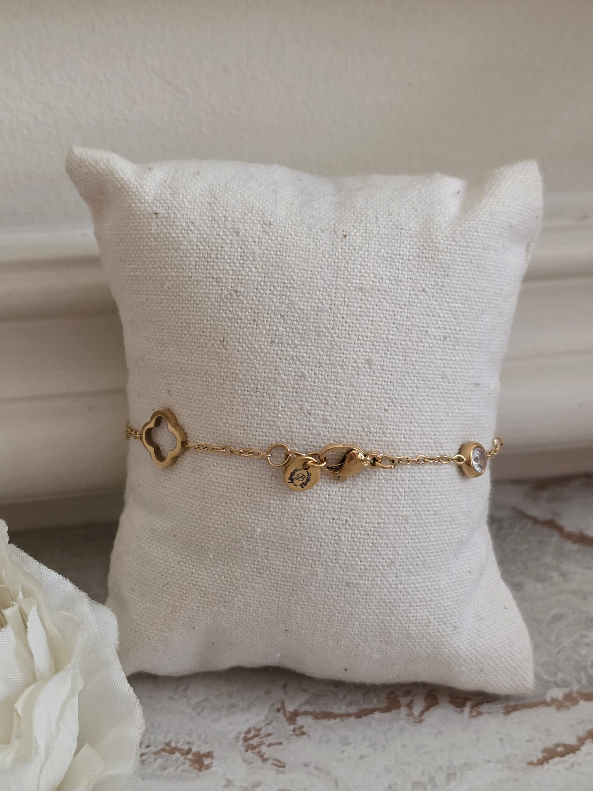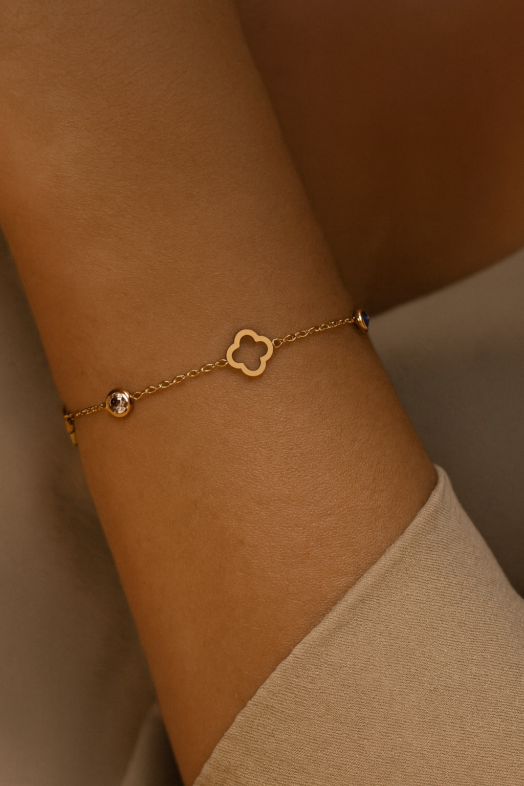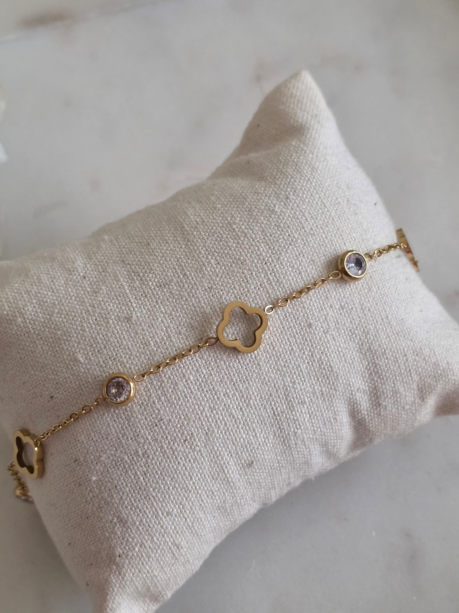 This elegant clover bracelet features a delicate gold-toned chain adorned with alternating open clover motifs and bezel-set sparkling stones. The minimalist yet sophisticated design makes it perfect for everyday wear or layering with other pieces, adding a touch of timeless charm and understated luxury to any outfit.