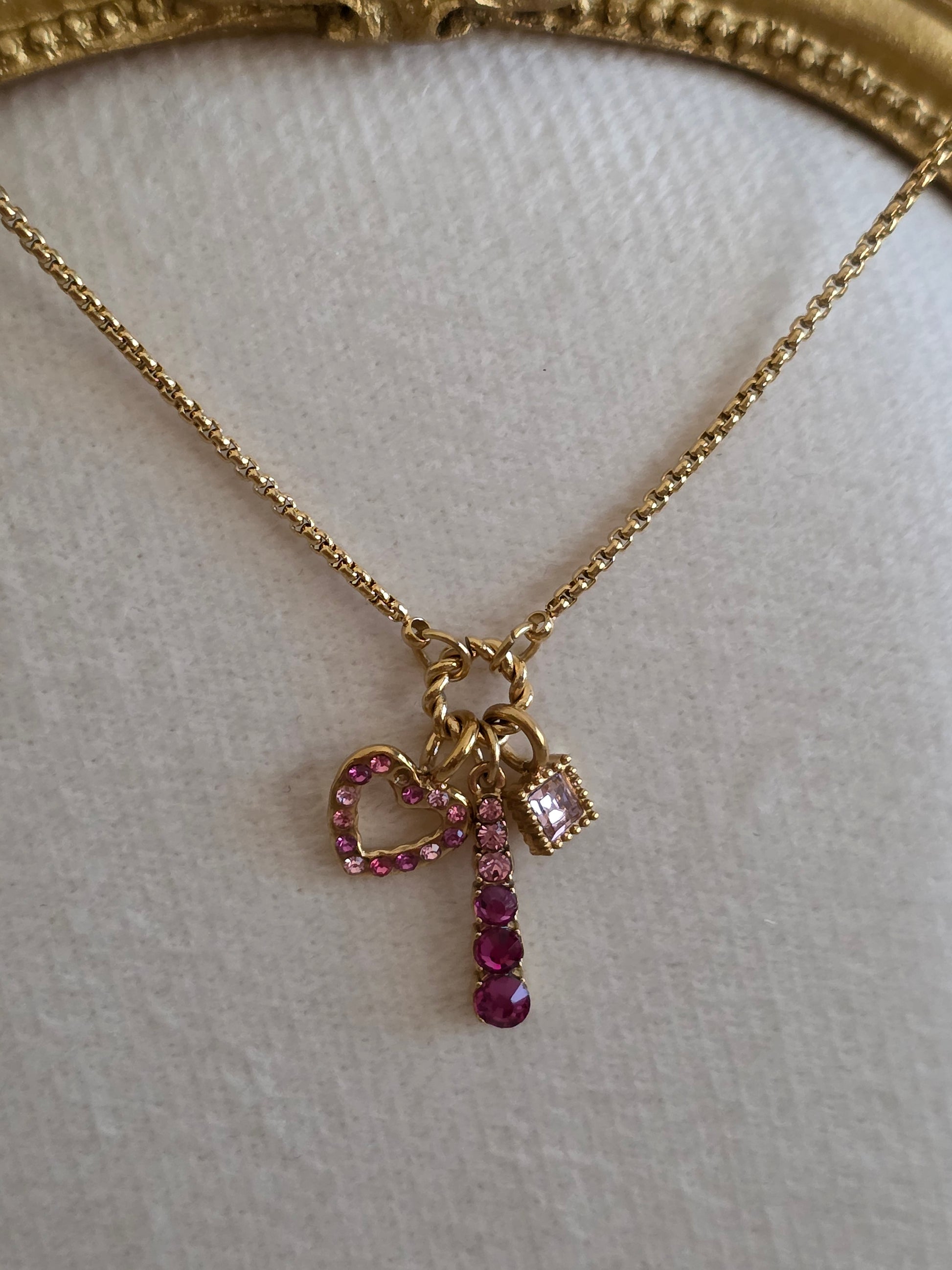 Playful yet elegant, our Pink Charm Necklace features three dazzling pendants — a sparkling open heart, a drop charm with brilliant pink stones, and a petite square-cut cubic zirconia. Each charm captures the light beautifully, creating a romantic and feminine look that stands out effortlessly.