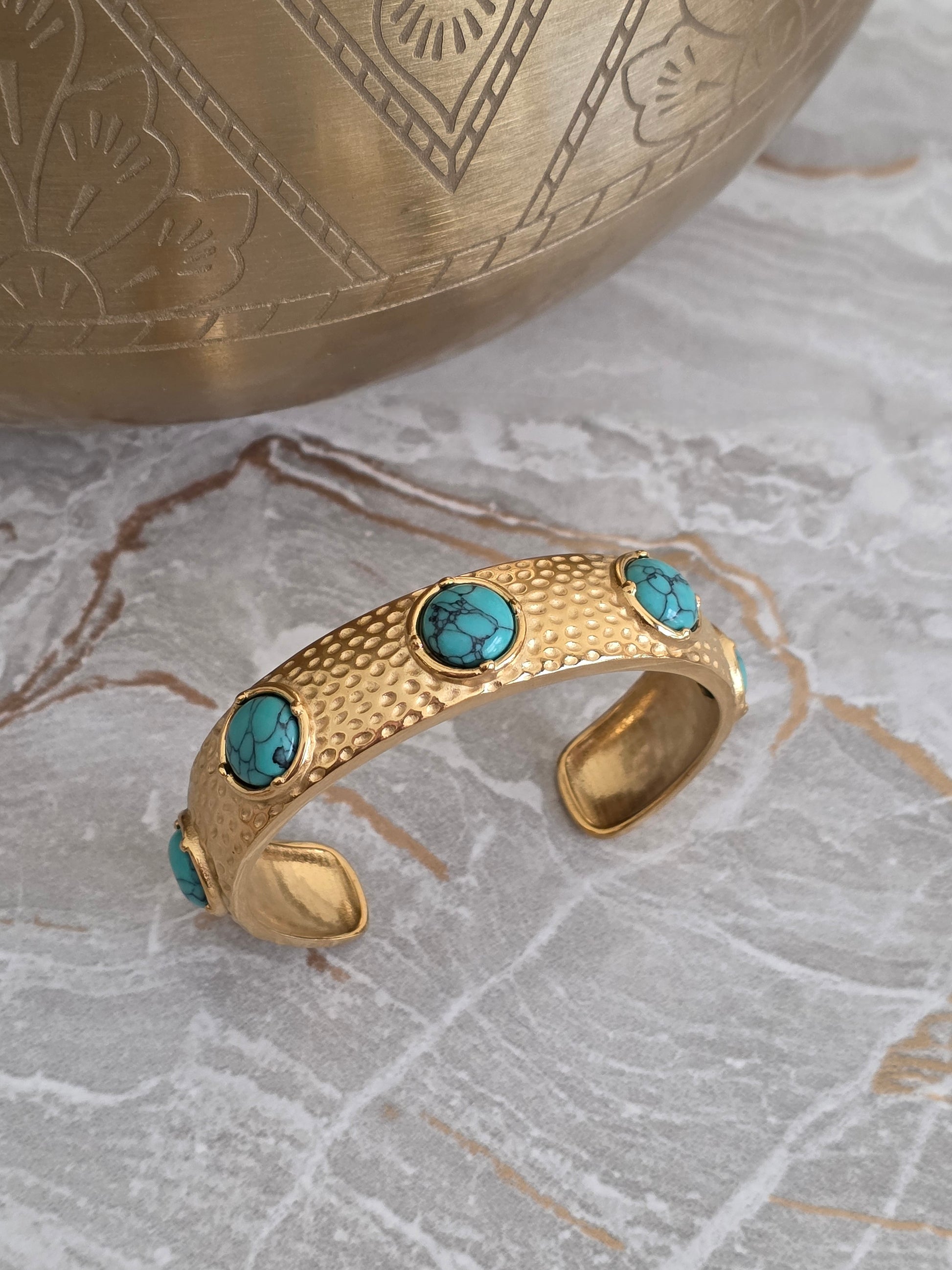 Crafted from high-quality stainless steel and finished with 18K gold plating, this piece combines durability with luxurious shine. Each turquoise stone is uniquely veined, giving every bangle its own distinctive charm. Perfect for adding a touch of bohemian luxury to any outfit, from casual to chic.