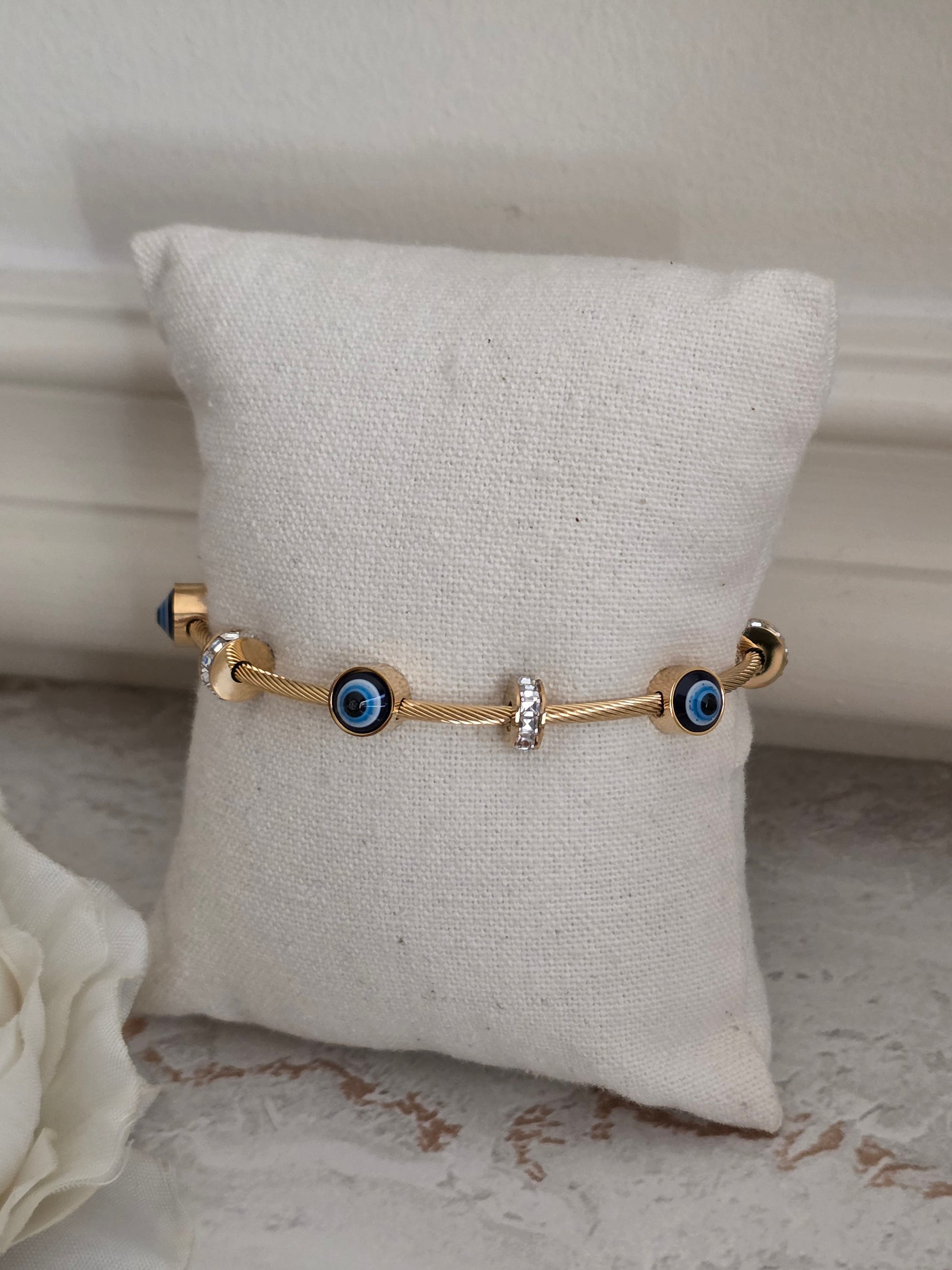 Add a touch of elegance to your look with this stunning evil eye bangle. Crafted from high-quality stainless steel with a luxurious gold finish, it features delicate blue evil eye charms. Sparkling cubic zirconia accents add a subtle shimmer, making it perfect for both everyday wear and special occasions.