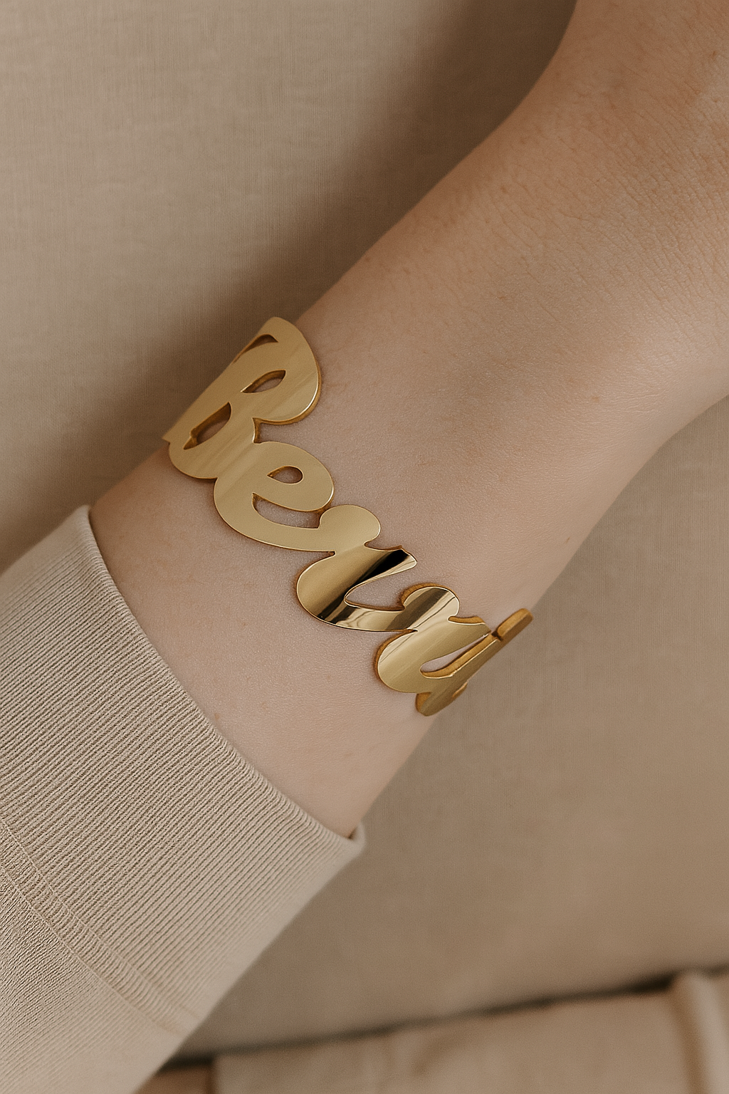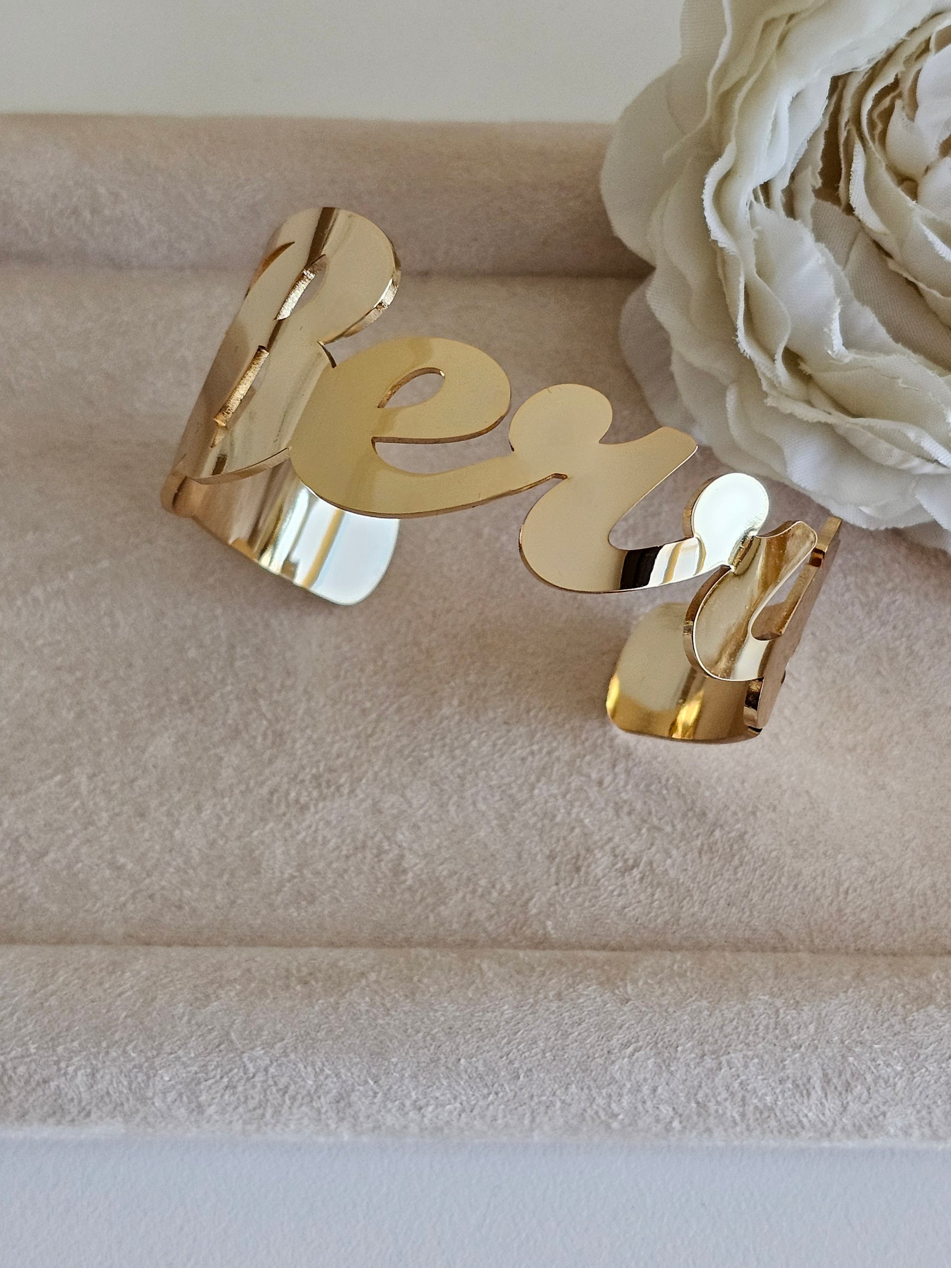 Select font style in pictures, than select bracelet colour, which is available in gold, rose gold and silver.