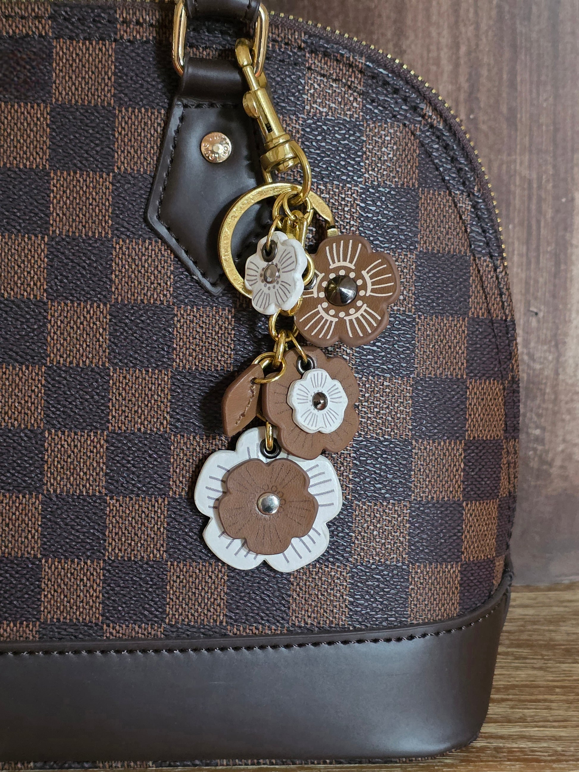 Add a touch of timeless elegance to your handbag with this vintage-inspired flower charm keychain. Crafted from faux leather in warm beige and brown tones, each layered flower features intricate petal detailing and a gleaming gold-tone finish that complements any designer or minimalist bag.