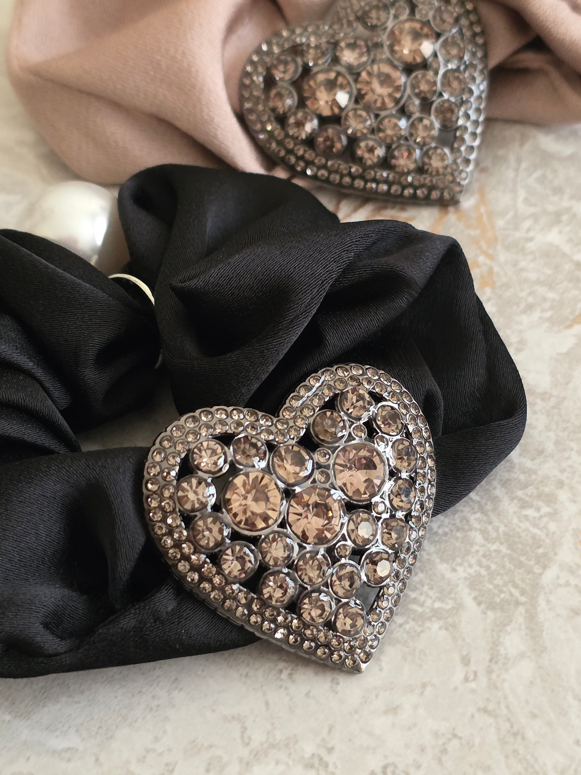 Add a touch of elegance to your hairstyle with this handmade rhinestone and faux pearl hair tie. Featuring soft scrunchie fabric in classic black and beige tones, each piece is adorned with a sparkling heart-shaped rhinestone charm and a dangling faux pearl accent. Perfect for dressing up a casual look or complementing evening wear, this accessory brings both glam and charm to any outfit.