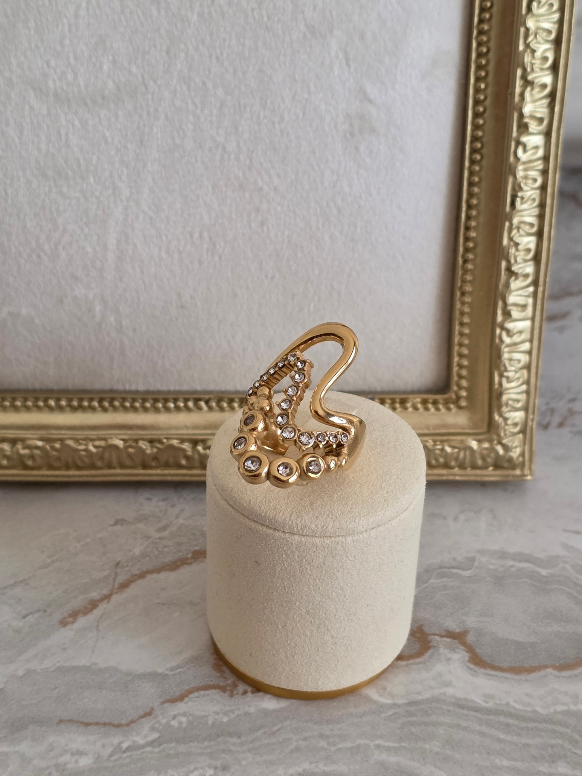 Elegant with a modern twist, the Sandra Ring is designed to stand out. This unique open-style ring features a flowing gold silhouette paired with delicate cubic zirconia crystals that shimmer beautifully from every angle. The combination of smooth polished gold and sparkling stones creates a striking yet refined look that feels both contemporary and timeless.
