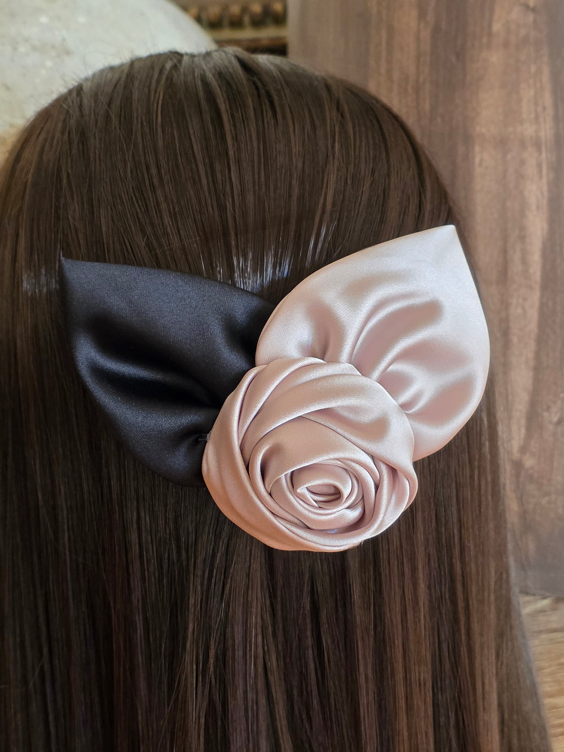 Satin rose hair clip is a charming accessory featuring a soft, fabric rose with a subtle sheen.
