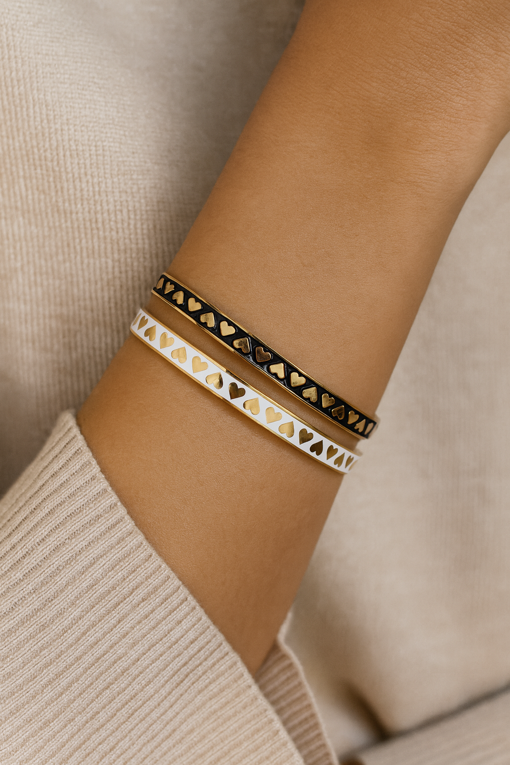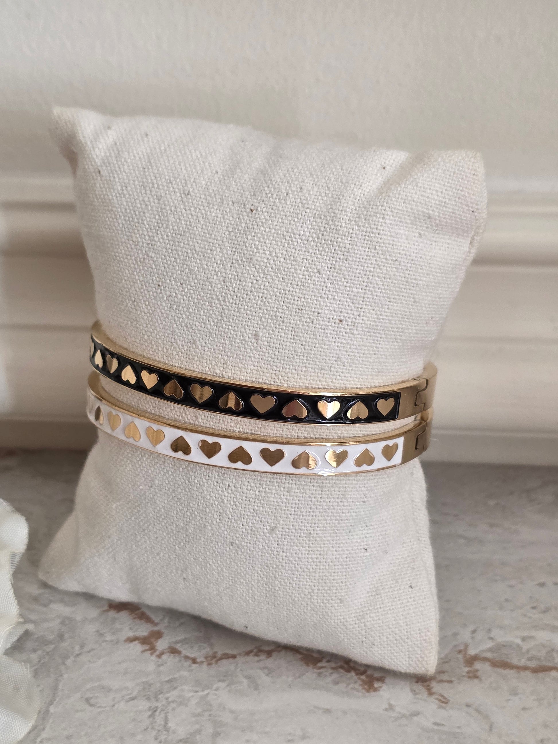 Add a touch of love to your style with these chic, oil-painted heart bangles. Available in classic black or elegant white, each bangle features delicate gold heart accents for a timeless, romantic vibe. Perfect for stacking or wearing solo for a subtle statement.