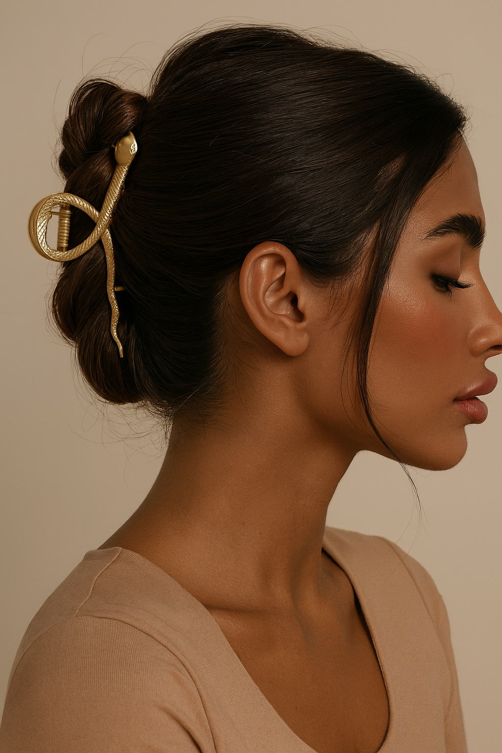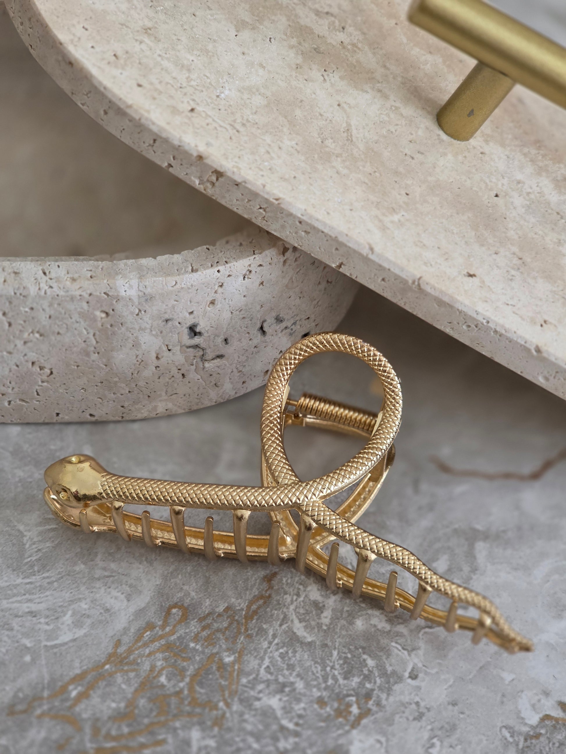 Add a bold and elegant touch to your hairstyle with the Gold Snake Hair Claw. Featuring a sleek, textured serpent design with a curved silhouette, this piece combines modern luxury with statement style.