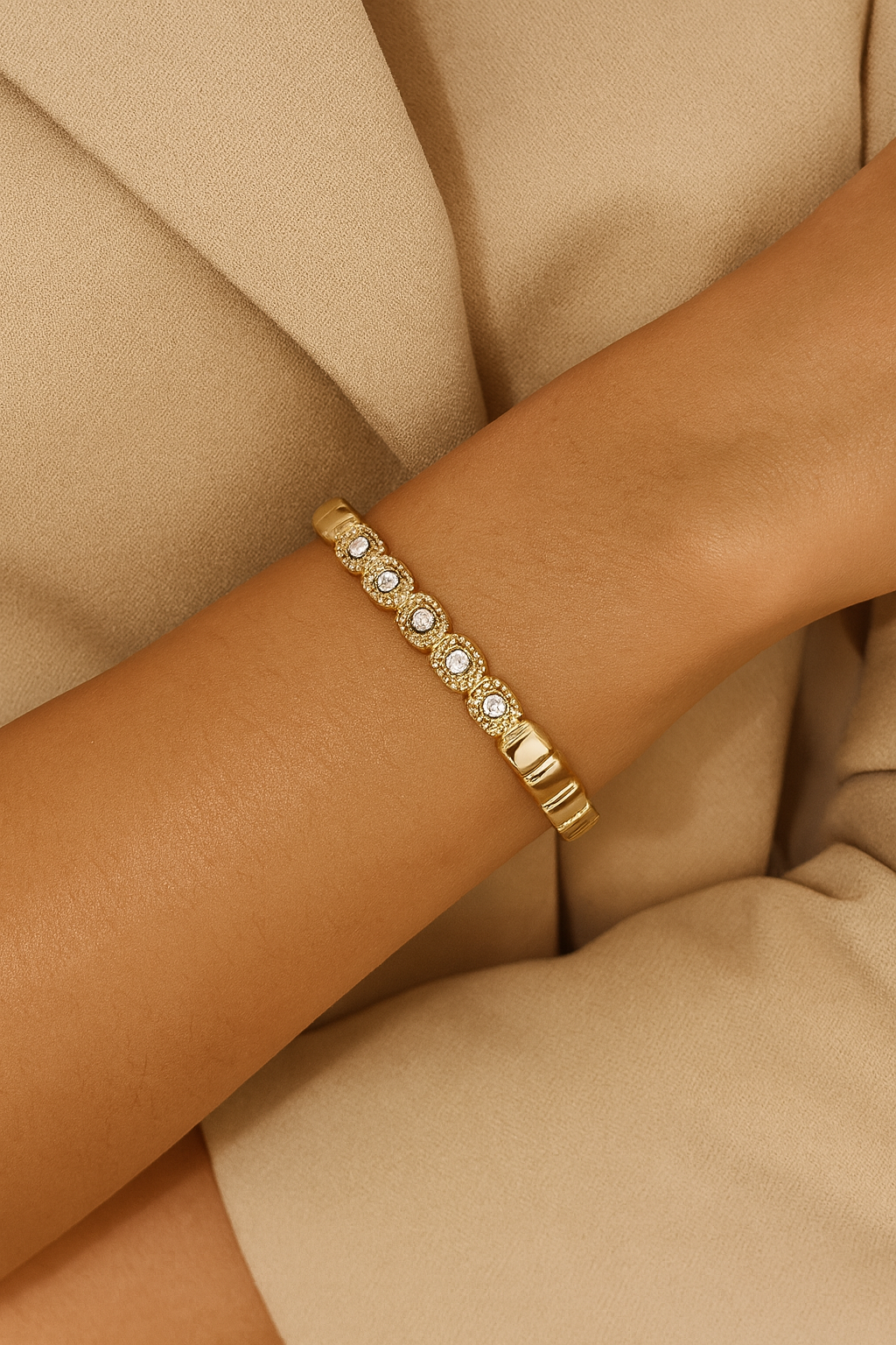 Bangle Size: Inner diameter 5.9 cm. Has a clasp that opens for an easy effortless fit.