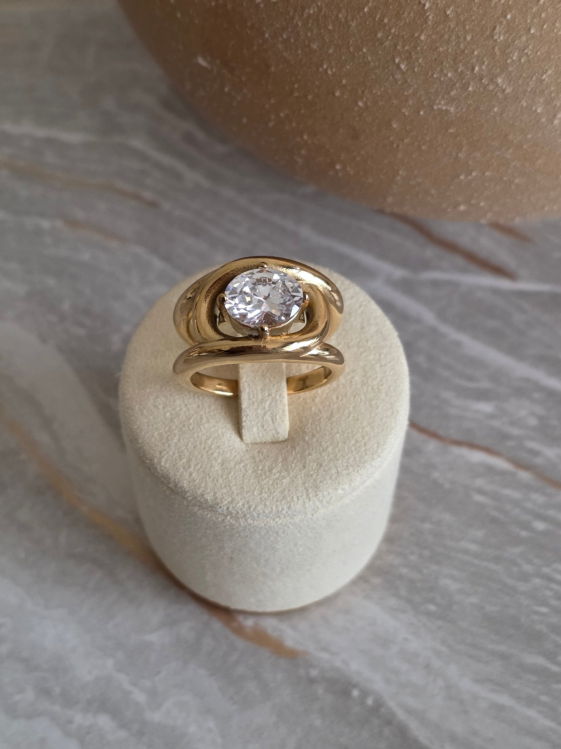 Make a bold yet elegant statement with our Gold Swirl Cubic Zirconia Ring. Featuring a radiant round-cut cubic zirconia stone embraced by a sculptural gold swirl design, this ring combines modern artistry with timeless sparkle.