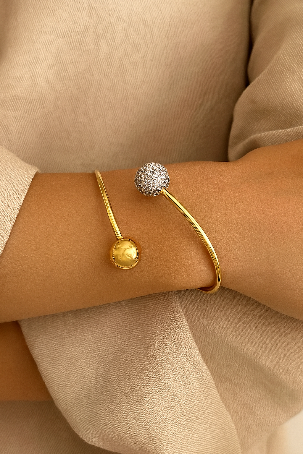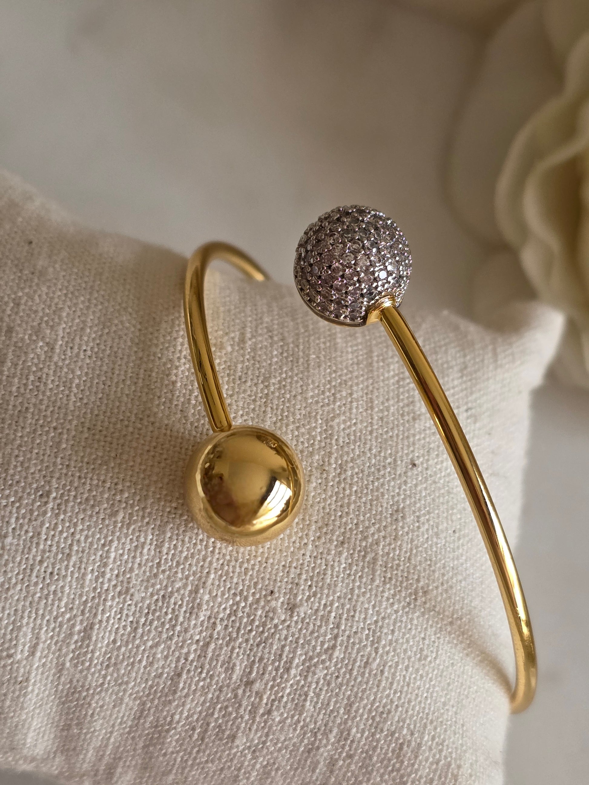 This sleek open-ended bangle features a modern dual-ball design, combining timeless elegance with a touch of sparkle. One end showcases a polished gold-tone sphere, while the other is adorned with a shimmering ball encrusted with high-quality cubic zirconia, catching the light beautifully. Crafted from durable stainless steel with a luxurious gold finish, this bangle is lightweight, comfortable, and perfect for both everyday wear and special occasions.